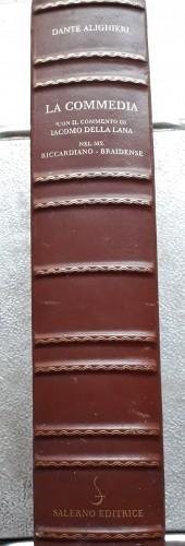 in 4° (cm 35,5 × 22,5), pp. 582 (cc. II, 187, 100, II); leg. edit. m/pelle, ds. a nervi con tit. e fregi in oro. Edizione Nazionale dei Commenti Danteschi. Tiratura limitata a 599 esemplari, più 26 distinti, fuori commercio contrassegnati con lettere dell'alfabeto (ns. n° 233), del prezioso manoscritto diviso in due frammenti, uno conservato alla Biblioteca Riccardiana e l'altro alla Braidense. Si tratta del più antico documento che dà inizio ad una prassi che diverrà usuale: quella di giustapporre il testo ed il commento all'interno di uno stesso manoscritto. Ornano l'opera 200 capilettera miniati e riccamente dorati, distinguendo l'inizio di ogni canto: quelli più grandi per il testo e quelli più piccoli per il commento. Iacomo della Lana fu autore di uno dei primi e più accreditati e completi commenti alla Commedia, databile all'incirca fra il 1323 e il 1328: dunque a brevissima distanza dalla morte di Dante. Un commento che si impose subito tra i contemporanei e i lettori più tardi dell'opera dantesca, non solo per la scrittura in volgare, contro l'ampio uso del latino tra i chiosatori della Commedia, ma per l'acume dell'interpretazione e la chiarezza espositiva, che lo posero spesso in concorrenza anche con il poco più tardo, e non meno apprezzato 'Ottimo Commento', che spesso accoglie interi brani o sezioni del commento lanèo, incorporati nel testo. L'entità del suo successo tra i contemporanei e i posteri è attestata dal centinaio abbondante dei manoscritti che lo hanno tramandato (contro le poche decine dello stesso Ottimo). Completa l'opera un fascicolo di 16 pp. contenente un saggio di A. Mazzucchi e G. Pomano. Nuovo e perfetto. 002/30 BIS