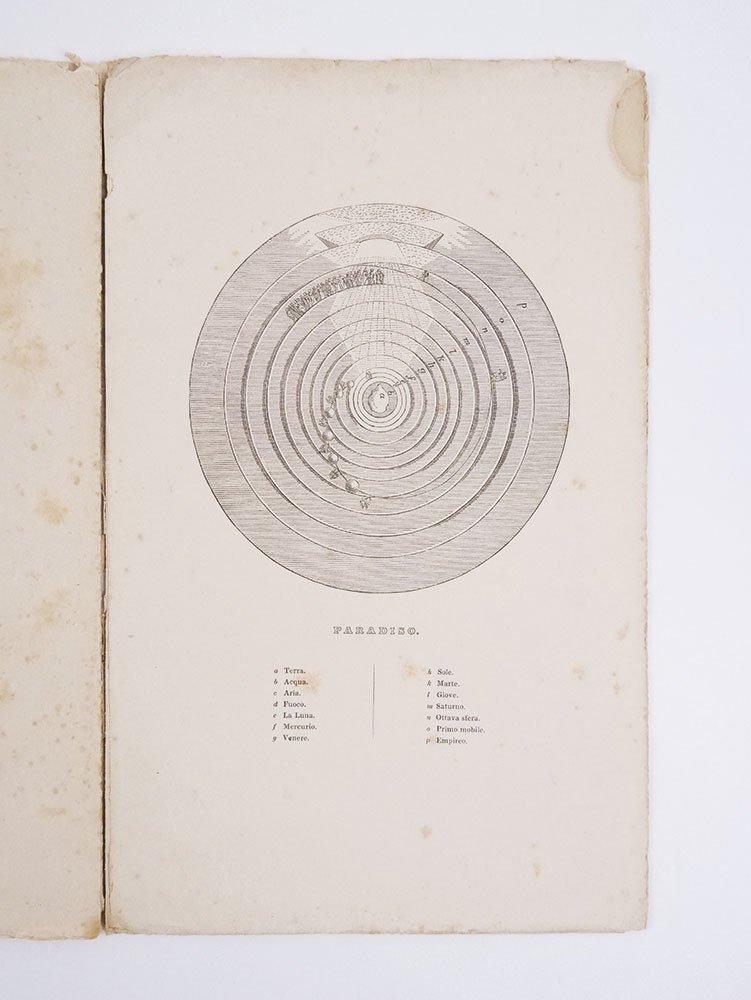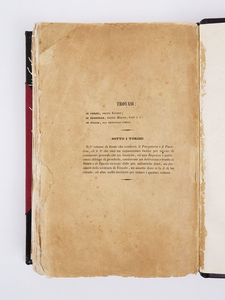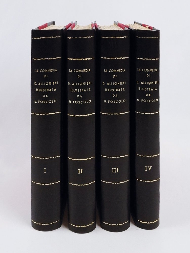 - pp. [4] XXX (ma XXVIII) [2] 467; [4] 396; [4] 560; [4] 418; fascicolo: 8 fogli sciolti e un bifolio per un totale di 10 tavole: ritratto di Foscolo; ritratto di Dante; ritratto di Dante all’età di 25 anni; fac-simile di un manoscritto del Foscolo; piante dell’Inferno, del Purgatorio e del Paradiso; interno della tomba di Dante; tomba di Dante in Ravenna (queste due su bifolio); veduta del cimitero di Chiswick, dove fu sepolto Foscolo.