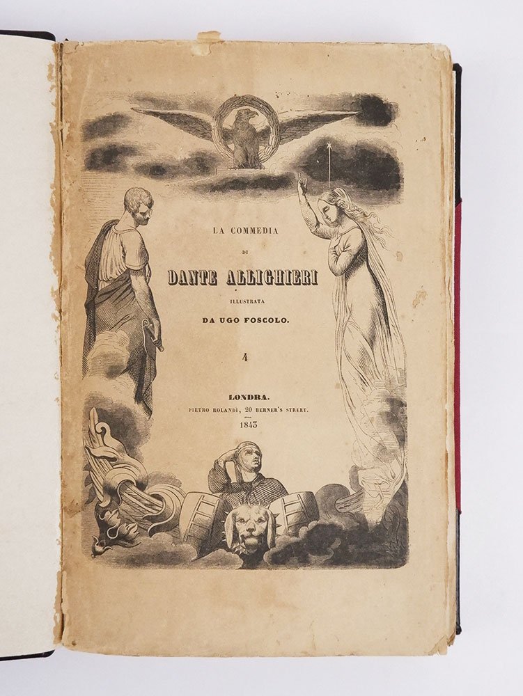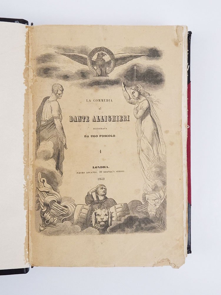 LIBROPrima edizione completa, nella rara tiratura su carta velina a mano.Splendida raccolta conservata così come licenziata dalla stamperia, nelle sue brossure originali a pieni margini con barbe (240 x 155 mm) e con le tavole a parte nell’apposito fascicolo brossurato; normali fioriture sparse dovute alla qualità della carta, presenti in quantità inferiore a quella usualmente riscontrata nelle copie soggette al normale trascorrere del tempo.L’opera fu impressa in una tiratura normale su carta vergata e in una tiratura più limitata su «carta velina a mano», generalmente sconosciuta ai bibliografi ma ben individuata nella collezione Acchiappati, che distingue le due tirature rispettivamente ai numeri 155 e 156 della sua catalogazione. L’edizione Rolandi della «Commedia» allestita da Foscolo si deve alle cure di Giuseppe Mazzini, che si firma nell’introduzione «Un italiano». Nel 1825 Foscolo aveva pubblicato per l’editore Pickering di Londra il «Discorso sul testo e su le opinioni diverse prevalenti intorno alla storia e alla emendazione critica della Commedia di Dante», il primo volume di quella che, nelle intenzioni del poeta, doveva essere una grande edizione della «Commedia», progettata in cinque tomi. Foscolo presentò all’editore il commento dell’«Inferno», ma per quanto riguarda «Purgatorio» e «Paradiso» consegnò manoscritti incompleti e in alcune parti appena abbozzati. La morte di Foscolo nel 1827 fece infine tramontare il progetto, e i manoscritti rimasero nei magazzini di Pickering. Dieci anni più tardi, Mazzini entrò in possesso delle carte di Foscolo e, dopo un lungo lavoro di rielaborazione, poté pubblicare l’opera: il primo volume (1842), accoglie il «Discorso» del 1825, preceduto da una «Prefazioncella» inedita di Foscolo; il secondo (1842) l’«Inferno»; il terzo (1843) «Purgatorio» e «Paradiso», in un unico volume, data l’esiguità delle note foscoliane; il quarto (1843) la cronologia, la vita di Dante, l’elenco e la descrizione dei codici rintracciati presso librerie e biblioteche, e l’indice.Raccolta foscoliana Acchiappati, n. 156