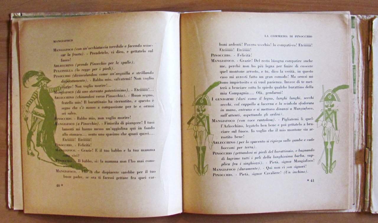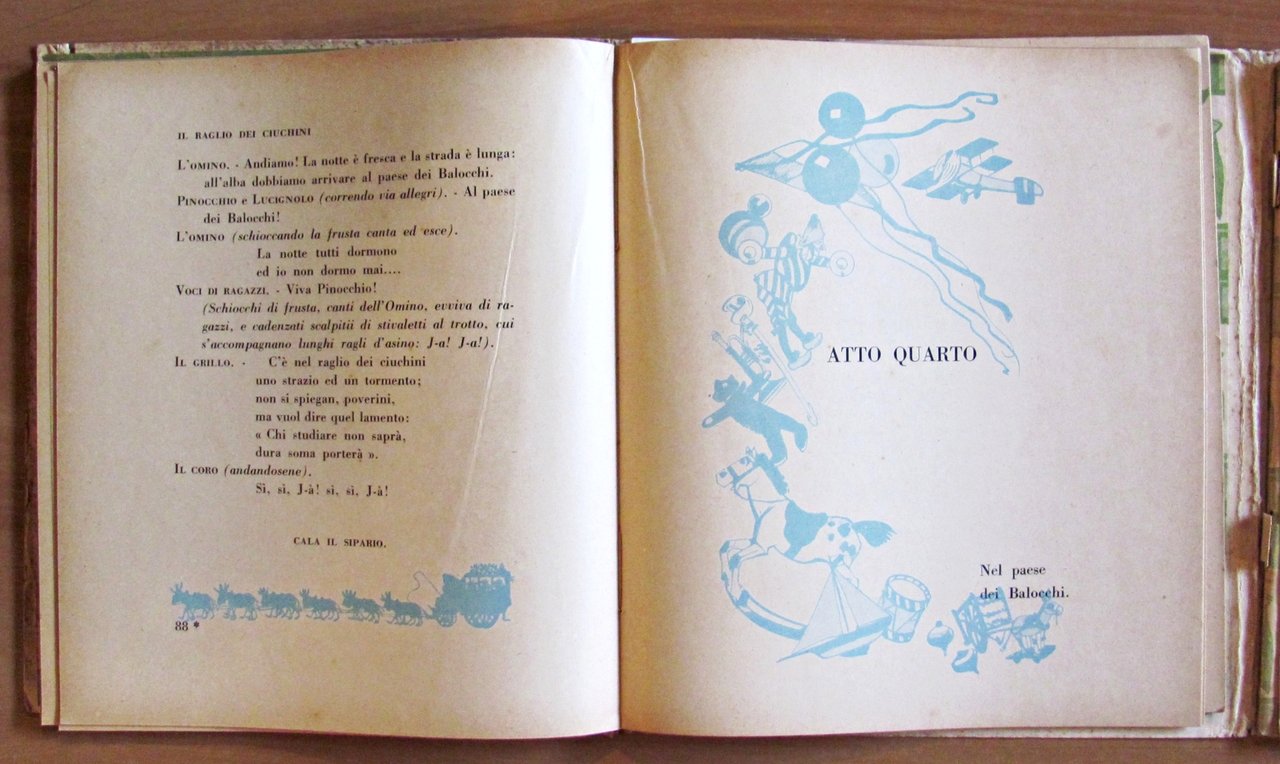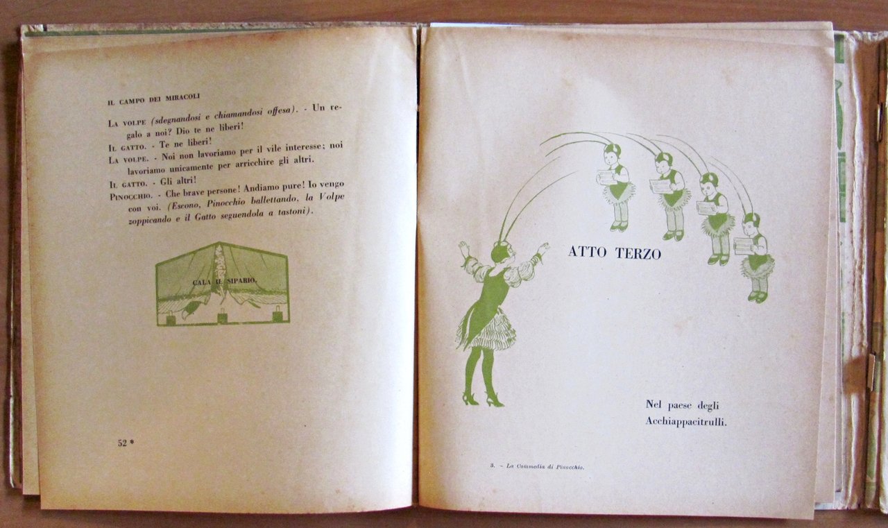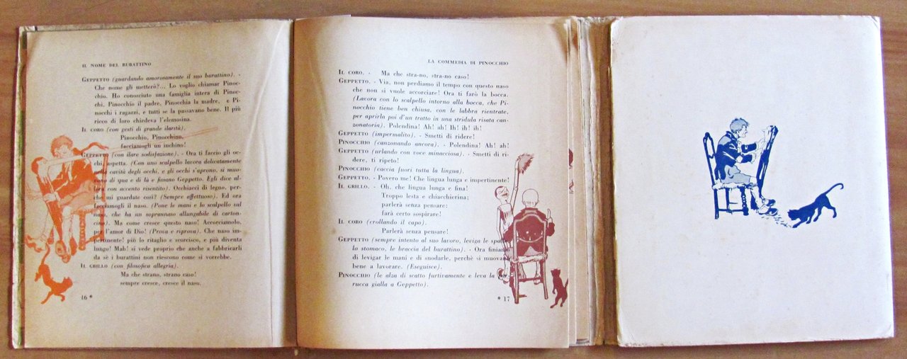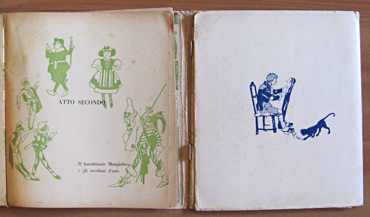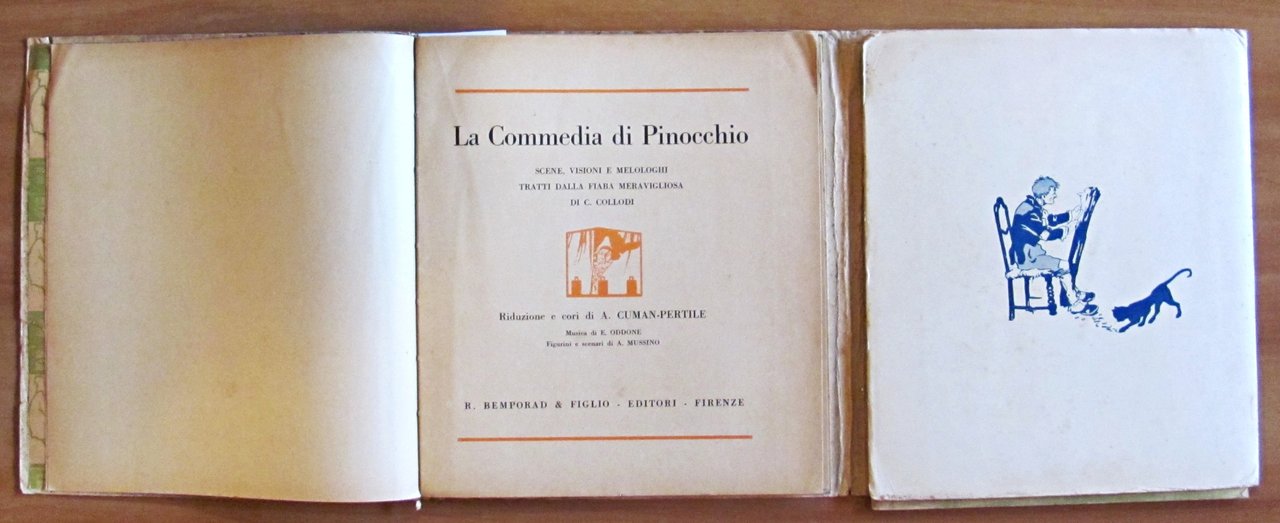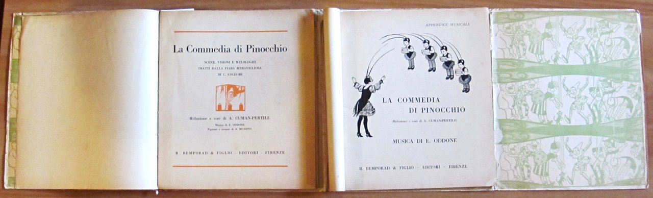 Scene, visioni e melologhi tratti dalla fiaba meravigliosa di C. Collodi. Musica di E. Oddone. Figurini e scenari di A. Mussino. Illustrazioni in tinta n.t. di Attilio Mussino. Completo di spartito allegato. Ed. Bemporad - Firenze, 1926. Ed. Bemporad - Firenze, 1926. Brossura editoriale con imperfezioni al margine esterno delle copertine. Risguardi illustrati. Contiene anche il libretto degli spartiti musicali collegati alle scenette. Lievi spellature della carta alla cerniera della copertina anteriore e libretto musicale staccato alle spille ma perfettamente integro e fresco. 18x20; pp.127 + 56 di spartiti. Molto Raro e in Buonissimo stato. , Molto buono (Very Good)