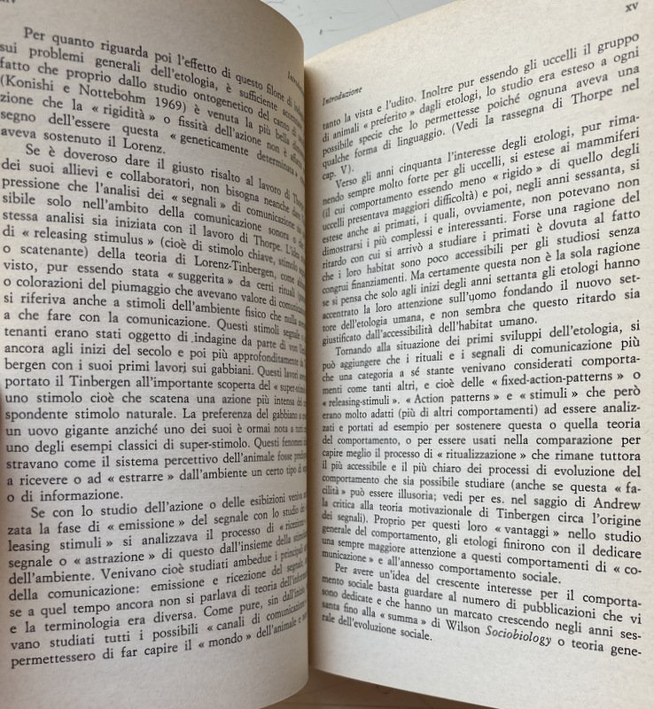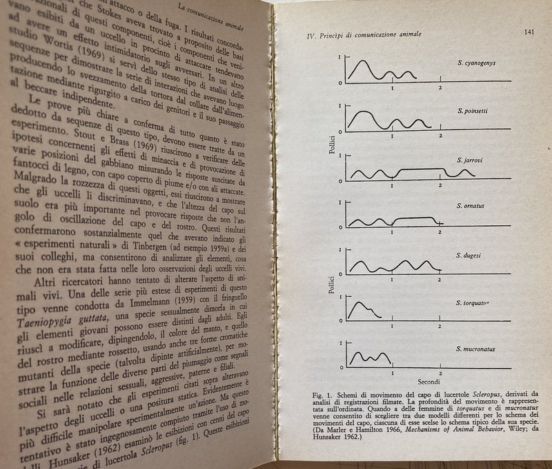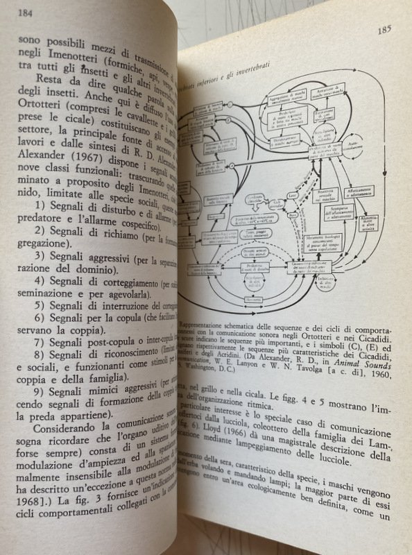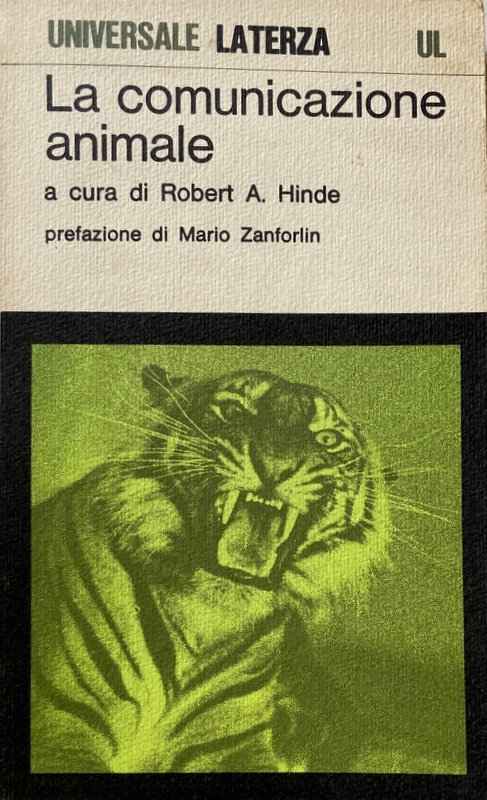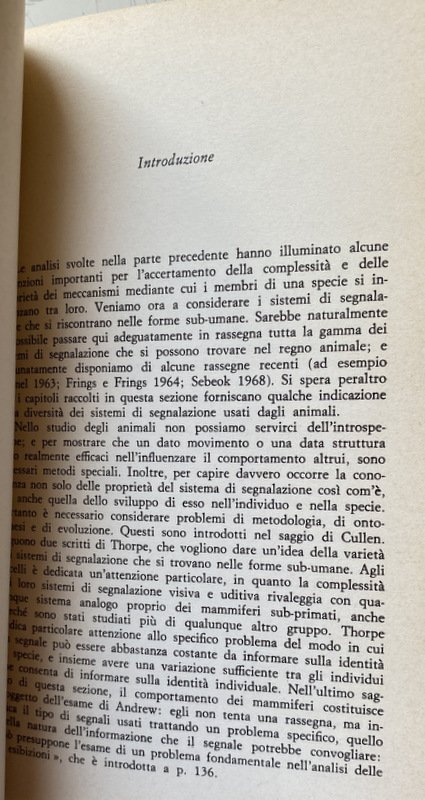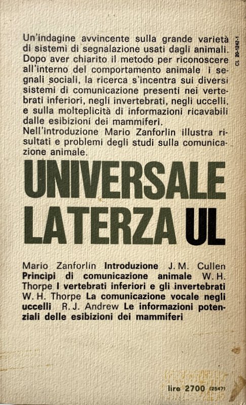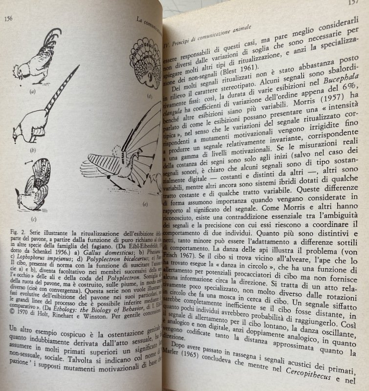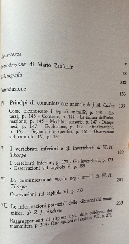 Soggetti: Etologia, Zoosemiotica, Zoologia, Comunicazione non verbale, Linguistica, Linguaggio, Psicologia comparata, Uomini, Esseri umani, Animali, Mondo animale, Comportamento, Comunicare, Specie, Natura, Scienze sociali, Bruno Munari, Tullio De Mauro, Re Salomone, Konrad Lorenz, San Francesco, Charles Darwin, Uccelli, Segni, Segnali acustici, visivi, tattili, Suoni, Evoluzione, Ontogenesi, Riti, Rituali, Ritualizzazione, Vertebrati, Invertebrati, Mammiferi, Esibizioni, Osservazioni, Risposte, Ornitologia, Esperimenti, Informazioni, Trasmissione, Hubert, Mable Frings, Danilo Mainardi, Gerarchie, Corteggiamento, Riproduzione, Difesa, Territorio, Riconoscimento, Gruppi, Comunità, Individui, Relazioni, Biologia, Coordinazione, Cooperazione, Ecologia, Istinto, Intelligenza, Le Comportement animal: Une synthèse d'éthologie et de psychologie comparative, Modelli, Significato, Studi, Meccanismi, Imprinting, Apprendimento, Imitazione, Paura, Fuga, Attacco, Aggressività, Ferormoni, Attrazione, Adattamento, Ambiente, Rinforzamento, Assuefazione, Protezione, Rettili, Erpetologia, Teorie, Labirinto, Stimoli, Movimenti, Volo, Ali, Memoria, Condizionamento, Karl von Frisch, Lloyd Morgan, Douglas Spalding, Uexküll, Hans Lissmann, Oskar Heinroth, Niko Tinbergen, Nido, Nidificazione, Cuccioli, Allevamento, Altenberg, Insetti, Farfalle, Imprinting, Sistema nervoso centrale, Innatismo, Minaccia, Gabbiani, Pesci, Rostro, Piume, Becco, Genitori, Interazioni, Avversari, Conquista, Occupazione, Territorialità, Imenotteri, Nomadismo, Spostamenti, Stormi, Fringuelli, Sessualità, Direzione, Distanza, Richiamo, Danza, Acqua, Grugnito, Vagito, Fusa, Latrato, Barrito, Anfibi, Rana, Gallo, Gallina, Api, Fagiano, Pavone, Accoppiamento, Étienne, Schemi di azione fissi, Pulcini, Api, Naturalisti, Cibo, Alimentazione, Impollinamento, Caccia, Lotta, Maschi, Femmine, Ectoparassiti, Vantaggio, Scimmie, Scimpanzé, Lucciole, Colori, Pelle, Mimesi, Mimetizzazione, Combattimenti, Antilopi, Selezione naturale, Specializzazione, Performance, E.O. Wilson, W. Craig, J.S. Huxley, J.B. Falls, Emancipazione, Thomas A. Sebeok, Critica, Genetica, Primati, Habitat, Catena alimentare, Canto, Sonograph, Playback, Clever Hans, Riconoscimento, A.D. Blest, J.C. Brémond, Noam Chomsky, K. Immelmann, P. Marler, W. Wickler, R.D. Alexander, R.R. Capranica, J. Crane, D.J. Crisp, I. Eibl-Eibesfeldt, K. Frisch, L.T. Evans, H. Kleerekoper, J.P. Froloff, T.W. Galloway, B.M. Shaffer, A.M. Wenner, W.N. Tavolga, P. Marler, D.L. Lack, W. Montagna, W.W. Roberts, Principi, Bibliografia, Riferimento, Consultazione, Manuali, Libri di testi universitari, Classici, Collezionismo, Libri Vintage fuori catalogo, Serpenti, Lucertole, Blurton Jones, Sokolov, Contrasto stimolatorio, Esibizioni, Pettirosso, Vocalizzi, Copulazione, Famiglia, Piccoli, Prede, Cicadidi, Ortotteri, Predatori, Lampeggiamenti, Imitazione, Chimica, Rivali, Morfologia, Ethology, Zoosemiotics, Zoology, Nonverbal communication, Linguistics, Language, Comparative psychology, Men, Human beings, Animals, Animal world, Behavior, Communicate, Species, Nature, Social sciences, King Solomon, Saint Francis, Birds, Signs, Acoustic signals, visual, tactile, Sounds, Evolution, Ontogeny, Rites, Rituals, Ritualization, Vertebrates, Invertebrates, Mammals, Performances, Observations, Answers, Ornithology, Experiments, Information, Transmission, Hierarchies, Courtship, Reproduction, Defense, Territory, Recognition, Groups, Community, Individuals, Relationships, Biology, Coordination, Cooperation, Ecology, Instinct, Intelligence, Patterns, Meaning, Studies, Mechanisms, Imprinting, Learning, Imitation, Fear, Escape, Attack, Aggression, Pheromones, Attraction, Adaptation, Environment, Reinforcement, Addiction, Protection, Reptiles, Herpetology, Theories, Labyrinth, Stimuli, Movements, Flight, Wings, Memory, Conditioning, Nesting, Cubs, Breeding, Altenberg, Insects, Butterflies, Central nervous system, Inbreeding, Threat, Seagulls, Fishes, Rostrum, Feathers, Beak, Parents, Interactions, Opponents, Conquest, Occupation, Territoriality, Hymenoptera, Nomadism, Movements, Flocks, Finches, Sexuality, Direction, Distance, Call, Dance, Water, Grunt, Wail, Purr, Bark, Trumpet, Amphibians, Frog, Rooster, Hen, Bees, Pheasant, Peacock, Mating, Étienne, Fixed action patterns, Chicks, Bees, Naturalists, Food, Feeding, Pollination, Hunting, Fight, Males, Females, Ectoparasites, Advantage, Monkeys, Chimpanzees, Fireflies, Colors, Skin, Mimesis, Camouflage, Fighting, Antelopes, Natural selection, Specialization, Exhibitions, Emancipation, Criticism, Genetics, Primates, Food chain, Singing, Recognition, Principles, Bibliography, Reference, Consultation, Manuals, Textbooks, Classics, Collectables, Out of print Books, Snakes, Lizards, Stimulatory Contrast, Vocalizations, Copulation, Family, Small, Prey, Cycads, Orthoptera, Predators, Flashes, Imitation, Chemistry, Rivals, Morphology