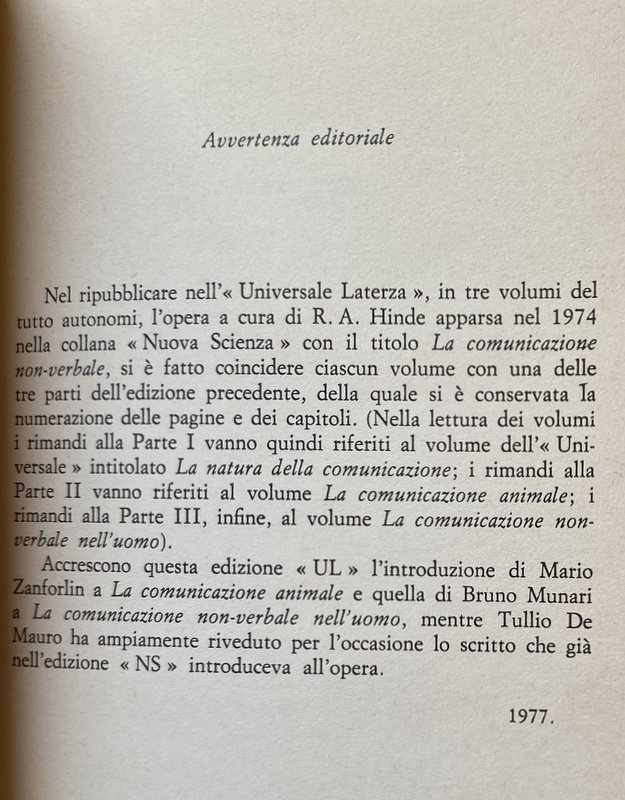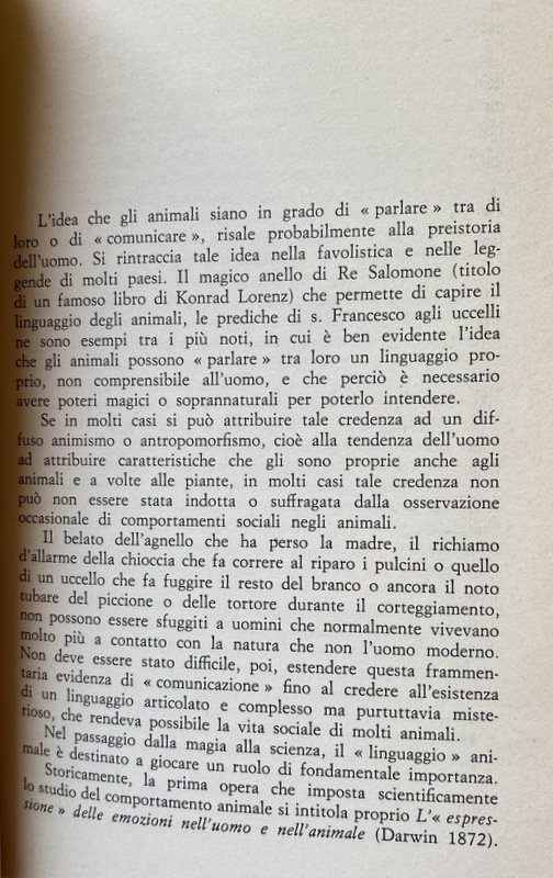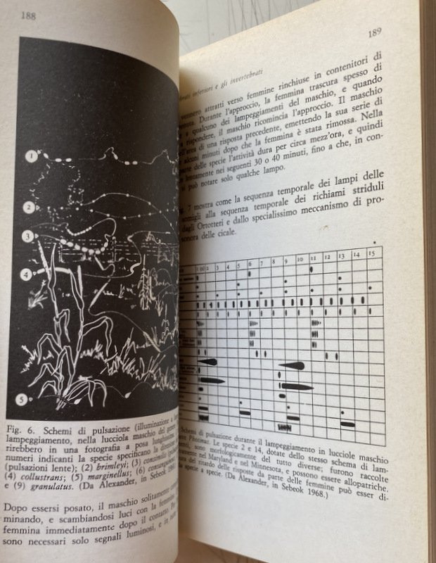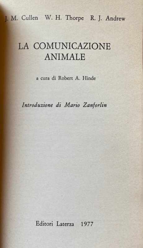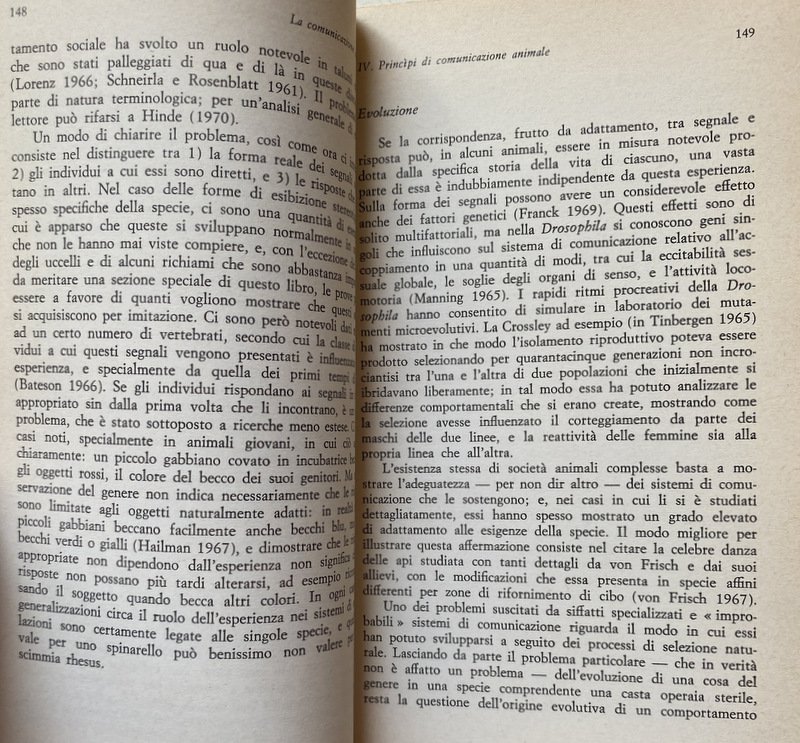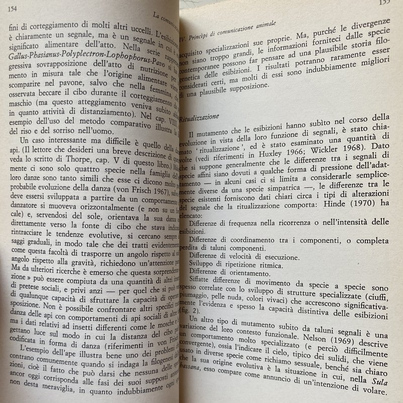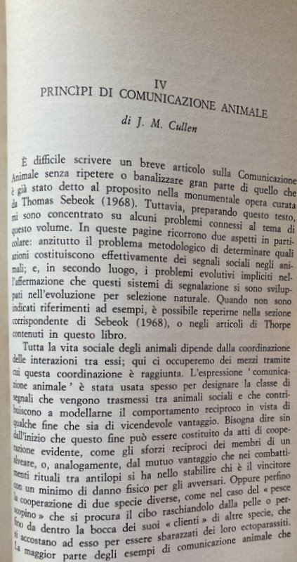 Soggetti: Etologia, Zoosemiotica, Zoologia, Comunicazione non verbale, Linguistica, Linguaggio, Psicologia comparata, Uomini, Esseri umani, Animali, Mondo animale, Comportamento, Comunicare, Specie, Natura, Scienze sociali, Bruno Munari, Tullio De Mauro, Re Salomone, Konrad Lorenz, San Francesco, Charles Darwin, Uccelli, Segni, Segnali acustici, visivi, tattili, Suoni, Evoluzione, Ontogenesi, Riti, Rituali, Ritualizzazione, Vertebrati, Invertebrati, Mammiferi, Esibizioni, Osservazioni, Risposte, Ornitologia, Esperimenti, Informazioni, Trasmissione, Hubert, Mable Frings, Danilo Mainardi, Gerarchie, Corteggiamento, Riproduzione, Difesa, Territorio, Riconoscimento, Gruppi, Comunità, Individui, Relazioni, Biologia, Coordinazione, Cooperazione, Ecologia, Istinto, Intelligenza, Le Comportement animal: Une synthèse d'éthologie et de psychologie comparative, Modelli, Significato, Studi, Meccanismi, Imprinting, Apprendimento, Imitazione, Paura, Fuga, Attacco, Aggressività, Ferormoni, Attrazione, Adattamento, Ambiente, Rinforzamento, Assuefazione, Protezione, Rettili, Erpetologia, Teorie, Labirinto, Stimoli, Movimenti, Volo, Ali, Memoria, Condizionamento, Karl von Frisch, Lloyd Morgan, Douglas Spalding, Uexküll, Hans Lissmann, Oskar Heinroth, Niko Tinbergen, Nido, Nidificazione, Cuccioli, Allevamento, Altenberg, Insetti, Farfalle, Imprinting, Sistema nervoso centrale, Innatismo, Minaccia, Gabbiani, Pesci, Rostro, Piume, Becco, Genitori, Interazioni, Avversari, Conquista, Occupazione, Territorialità, Imenotteri, Nomadismo, Spostamenti, Stormi, Fringuelli, Sessualità, Direzione, Distanza, Richiamo, Danza, Acqua, Grugnito, Vagito, Fusa, Latrato, Barrito, Anfibi, Rana, Gallo, Gallina, Api, Fagiano, Pavone, Accoppiamento, Étienne, Schemi di azione fissi, Pulcini, Api, Naturalisti, Cibo, Alimentazione, Impollinamento, Caccia, Lotta, Maschi, Femmine, Ectoparassiti, Vantaggio, Scimmie, Scimpanzé, Lucciole, Colori, Pelle, Mimesi, Mimetizzazione, Combattimenti, Antilopi, Selezione naturale, Specializzazione, Performance, E.O. Wilson, W. Craig, J.S. Huxley, J.B. Falls, Emancipazione, Thomas A. Sebeok, Critica, Genetica, Primati, Habitat, Catena alimentare, Canto, Sonograph, Playback, Clever Hans, Riconoscimento, A.D. Blest, J.C. Brémond, Noam Chomsky, K. Immelmann, P. Marler, W. Wickler, R.D. Alexander, R.R. Capranica, J. Crane, D.J. Crisp, I. Eibl-Eibesfeldt, K. Frisch, L.T. Evans, H. Kleerekoper, J.P. Froloff, T.W. Galloway, B.M. Shaffer, A.M. Wenner, W.N. Tavolga, P. Marler, D.L. Lack, W. Montagna, W.W. Roberts, Principi, Bibliografia, Riferimento, Consultazione, Manuali, Libri di testi universitari, Classici, Collezionismo, Libri Vintage fuori catalogo, Serpenti, Lucertole, Blurton Jones, Sokolov, Contrasto stimolatorio, Esibizioni, Pettirosso, Vocalizzi, Copulazione, Famiglia, Piccoli, Prede, Cicadidi, Ortotteri, Predatori, Lampeggiamenti, Imitazione, Chimica, Rivali, Morfologia, Ethology, Zoosemiotics, Zoology, Nonverbal communication, Linguistics, Language, Comparative psychology, Men, Human beings, Animals, Animal world, Behavior, Communicate, Species, Nature, Social sciences, King Solomon, Saint Francis, Birds, Signs, Acoustic signals, visual, tactile, Sounds, Evolution, Ontogeny, Rites, Rituals, Ritualization, Vertebrates, Invertebrates, Mammals, Performances, Observations, Answers, Ornithology, Experiments, Information, Transmission, Hierarchies, Courtship, Reproduction, Defense, Territory, Recognition, Groups, Community, Individuals, Relationships, Biology, Coordination, Cooperation, Ecology, Instinct, Intelligence, Patterns, Meaning, Studies, Mechanisms, Imprinting, Learning, Imitation, Fear, Escape, Attack, Aggression, Pheromones, Attraction, Adaptation, Environment, Reinforcement, Addiction, Protection, Reptiles, Herpetology, Theories, Labyrinth, Stimuli, Movements, Flight, Wings, Memory, Conditioning, Nesting, Cubs, Breeding, Altenberg, Insects, Butterflies, Central nervous system, Inbreeding, Threat, Seagulls, Fishes, Rostrum, Feathers, Beak, Parents, Interactions, Opponents, Conquest, Occupation, Territoriality, Hymenoptera, Nomadism, Movements, Flocks, Finches, Sexuality, Direction, Distance, Call, Dance, Water, Grunt, Wail, Purr, Bark, Trumpet, Amphibians, Frog, Rooster, Hen, Bees, Pheasant, Peacock, Mating, Étienne, Fixed action patterns, Chicks, Bees, Naturalists, Food, Feeding, Pollination, Hunting, Fight, Males, Females, Ectoparasites, Advantage, Monkeys, Chimpanzees, Fireflies, Colors, Skin, Mimesis, Camouflage, Fighting, Antelopes, Natural selection, Specialization, Exhibitions, Emancipation, Criticism, Genetics, Primates, Food chain, Singing, Recognition, Principles, Bibliography, Reference, Consultation, Manuals, Textbooks, Classics, Collectables, Out of print Books, Snakes, Lizards, Stimulatory Contrast, Vocalizations, Copulation, Family, Small, Prey, Cycads, Orthoptera, Predators, Flashes, Imitation, Chemistry, Rivals, Morphology
