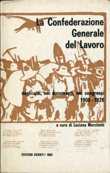LXVIII, 429 p., tav. : ill. ; 23 x 14 cm. Saggi e documentazioni, 5. Questo volume raccoglie i documenti fondamentali e le mozioni congressuali della Confederazione Generale del Lavoro (CGdL) il principale sindacato italiano nei primi vent'anni del '900. Fondato a Milano nel 1906, su iniziativa delle Camere del Lavoro, delle Leghe di resistenza e di 700 sindacati locali, contava all'atto della fondazione circa 250.000 iscritti, aumentati a oltre un milione e mezzo dopo il primo conflitto mondiale. Sindacato fortemente influenzato dal socialismo, gran parte dei suoi dirigenti e degli iscritti erano anche attivi nel Partito Socialista Italiano venne sciolto forzosamente dal fascismo, continuando l'attività nella clandestinità, per poi rinascere nel 1944, con il Patto di Roma e modificando il nome in CGIL. Prefazione di Franco Catalano. Brossura editoriale, coperta in cartoncino flessibile, sovraccoperta illustrata a colori in carta patinata lucida. All'interno varie tavole fuori testo illustrate in b/n su carta patinata lucida. Codice libreria 8293.
