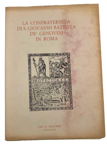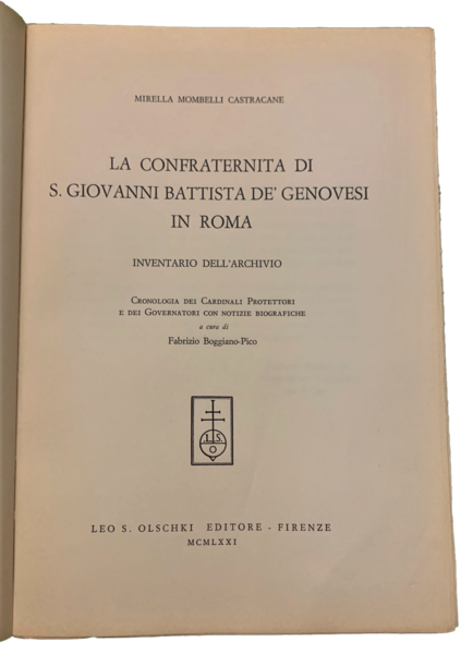 In 4°; (6), 272, (2) pp. e 20 c. di tav. Brossura editoriale con sopraccoperta editoriale (leggero alone rosso). Dedica di Fabrizio Boggiano-Pico alla prima carta bianca. Esemplare in buone-ottime condizioni di conservazione. Prima ed unica edizione di questo repertorio bibliografico che ripercorre la storia della Confraternita di S. Giovanni Battista de' Genovesi in Roma e presenta la sua collezione bibliografica e documentale.