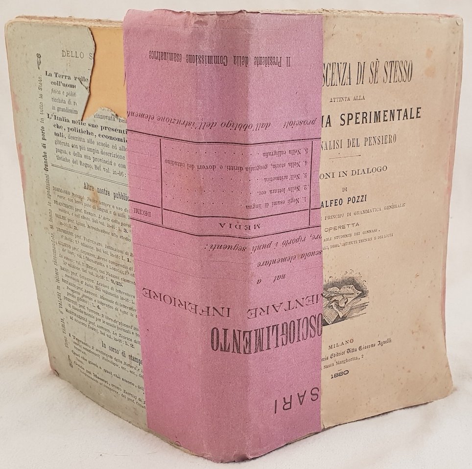 In 8. Dim. 19,5x12,5 cm. Pp. XXI+264.Interessante opera del 1880 sulla psicologia sperimentale scritta da Alfeo Pozzi. All'interno: cause interne ed esterne delle sensazioni, sensazioni, fantasia, potenze dell'anima, riflessione, intelligenza, percezioni, logica analitica, scrittura fonografica, ragionamento, sillogismo,m ragionamento, logica ecc. In discrete condizioni. Copertina assente. Dorso ricoperto da carta. Legatura in discrete condizioni con rotture. All'interno le pagine si presentano in buone condizioni con fioriture. Interesting work of 1880 about sperimental psychology written by Alfeo Pozzi. In fair conditions. Cover is missing. Spine covered by paper. Binding in fair conditions with cracks. Pages in good conditions with foxings.
