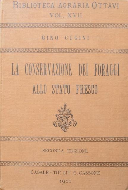 Biblioteca Agraria Ottavi, Vol. XVII. Tipografia e Litografia Carlo Cassone, Casale Monferrato, 1901. In 8vo, pp. X (di Prefazione e Indice), 190 + (6) di pubblicazioni editoriali Ottavi, ill. con 20 incisioni foto - tipiche in b/n n. t., e una tavola raffigurante "l'andamento della temperatura nei cumuli di foraggio compressi con la pressa blunt." leg. edit. in cartonato marrone con titoli in nero. Complessivamente in stato di conservazione ottimo.