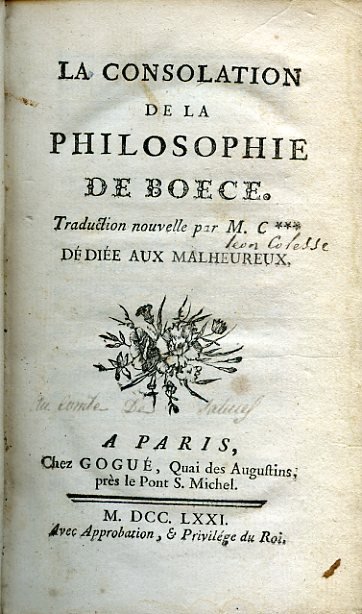 In-12° (170x99mm), pp. LXXVI, (4) di approvazione ed errata, 264, (2), legatura coeva pieno vitello marmorizzato con titolo in oro su tassello, filetti e decori floreali in oro al dorso. Tagli rossi, sguardie marmorizzate. Vignetta calcografica al titolo e, sotto di essa, una dedica antica 'au Comte de Saluce', probabilmente il Conte Alessandro Saluzzo di Monesiglio. Annotazioni ottocentesche alla prima c. bianca. Piccoli restauri alle cerniere e alle cuffie, lievi bruniture. Buon esemplare. Edizione originale della traduzione francese di Léon Colesse del 'De Consolatione Philosophiae' (il nome del traduttore non è indicato). Fra i capolavori della letteratura latina cristiana, l'opera boeziana, scritta in carcere tra il 523 ed il 524, è svolta in forma di dialogo intervallante prosa e versi tra l'autore e la Filosofia, in un'altissima meditazione in cui alla fede cristiana si intrecciano motivi del pensiero stoico e di quello neoplatonico; opera destinata a fortuna eccezionale nel Medioevo (sino al XII secolo essa fu la fonte precipua per la conoscenza di Platone e Aristotele, e da questo scritto deriva in buona parte la disputa sugli universali della speculazione del tempo), e cruciale nella formazione di Dante, che ad essa trasse conforto dopo la morte di Beatrice, fu definita da Gibbon 'un aureo volume che potrebbe essere stato composto da Platone o da Cicerone nei loro momenti di riposo'. Conlon, 71:705. Barbier, I, 2854.