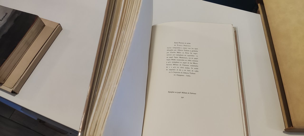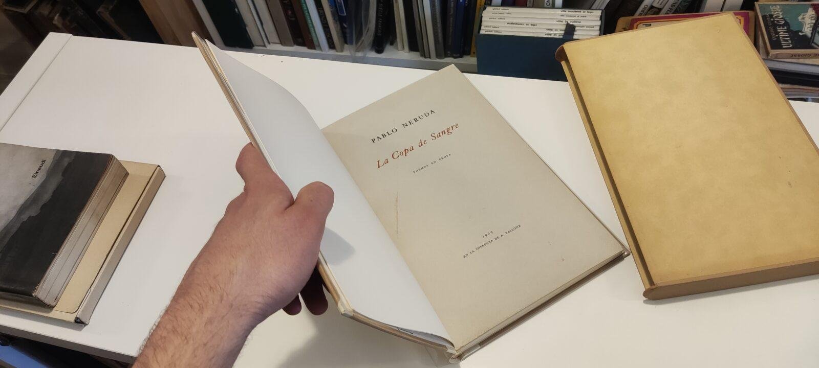 Pablo Neruda - La copa de sangre Poemas en prosa seguito da Adios a Tallone (scritto da Neruda appena venuto a conoscenza della morte improvvisa dell'editore) Tallone - Prima edizione 1969 Esemplare 392 di 507 in carta Miliani di Fabriano Libro in ottime condizioni, minimi segni del tempo: minime tracce di polvere al cofanetto. Non esitate a contattarci per altre foto o richieste. Saremo lieti di soddisfare ogni vostra esigenza.
