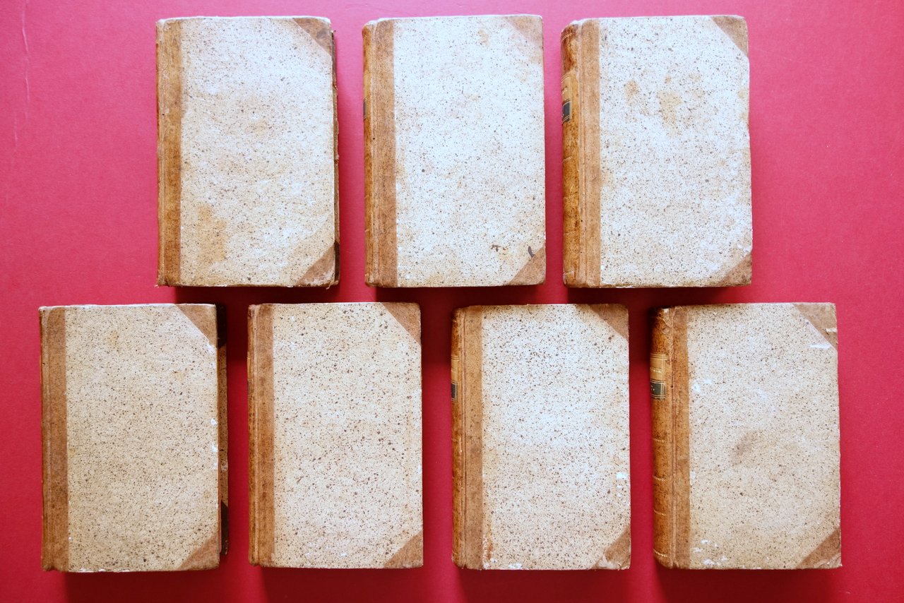 Settecentina, Giovanni de Gamerra Toscano, La Corneide Poema Eroi - Comico - opera completa in 7 tomi Mancanza dei dati tip., s. d. ma fine Settecento; cm 20x13,5; pp. [2]-501, con due belle tavole incise in b/n in apertura di volume: all'antiporta ritratto dell'autore e frontespizio allegorico (tomo I); pp. 528 (tomo II); pp. 534 (tomo III); pp. 510 (tomo IV); pp. 446 (tomo V); pp. 413 (tomo VI); pp. 426 (tomo VII); pregevole legatura ottocentesca in mezza pelle (dorso e angoli), con titolo e piccoli fregi impressi in oro al dorso, piatti marmorizzati, tagli rossi. Opera completa in sette tomi. Condizioni di conservazione Tomi tutti in buone condizioni con tracce d'uso; coperte con qualche piccola abrasione e leggeri aloni. Interni buoni con alcune lievi / leggere bruniture. Antiporta figurata del tomo I con una piccola mancanza al margine inf., che non interessa il testo. Rara opera completa in sette tomi, pregevolmente rilegati. Ampia opera di taglio goliardico-erotico, in cui l'autore compie un viaggio fantastico attraverso una lontana terra dove giungono numerosi cornuti di ogni grado e condizione sociale. La struttura in qualche modo imita, in chiave comica, quella della Commedia dantesca. Tale opera molto divertì l'allora ottantenne Voltaire e, per tale motivo, l'autore continuò fino a comporre sette volumi. Antiporta e frontespizio figurati del primo tomo sono stati realizzati rispettivamente da Pompeo e Giovanni Lapi di Livorno, nel 1781. SETT8.L21101 N