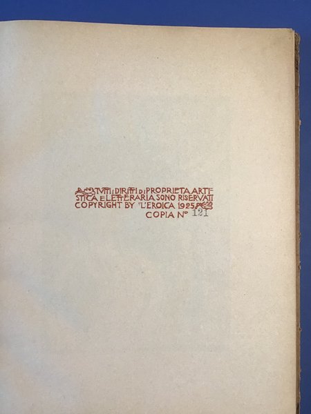 <br/>Legatura rilegato in cartonato editoriale<br/>Formato Quarto<br/>Num Pagine 172<br/>Illustrazioni numerose tavole in b/n<br/>Prima Edizione copia n 121 con Xilografie