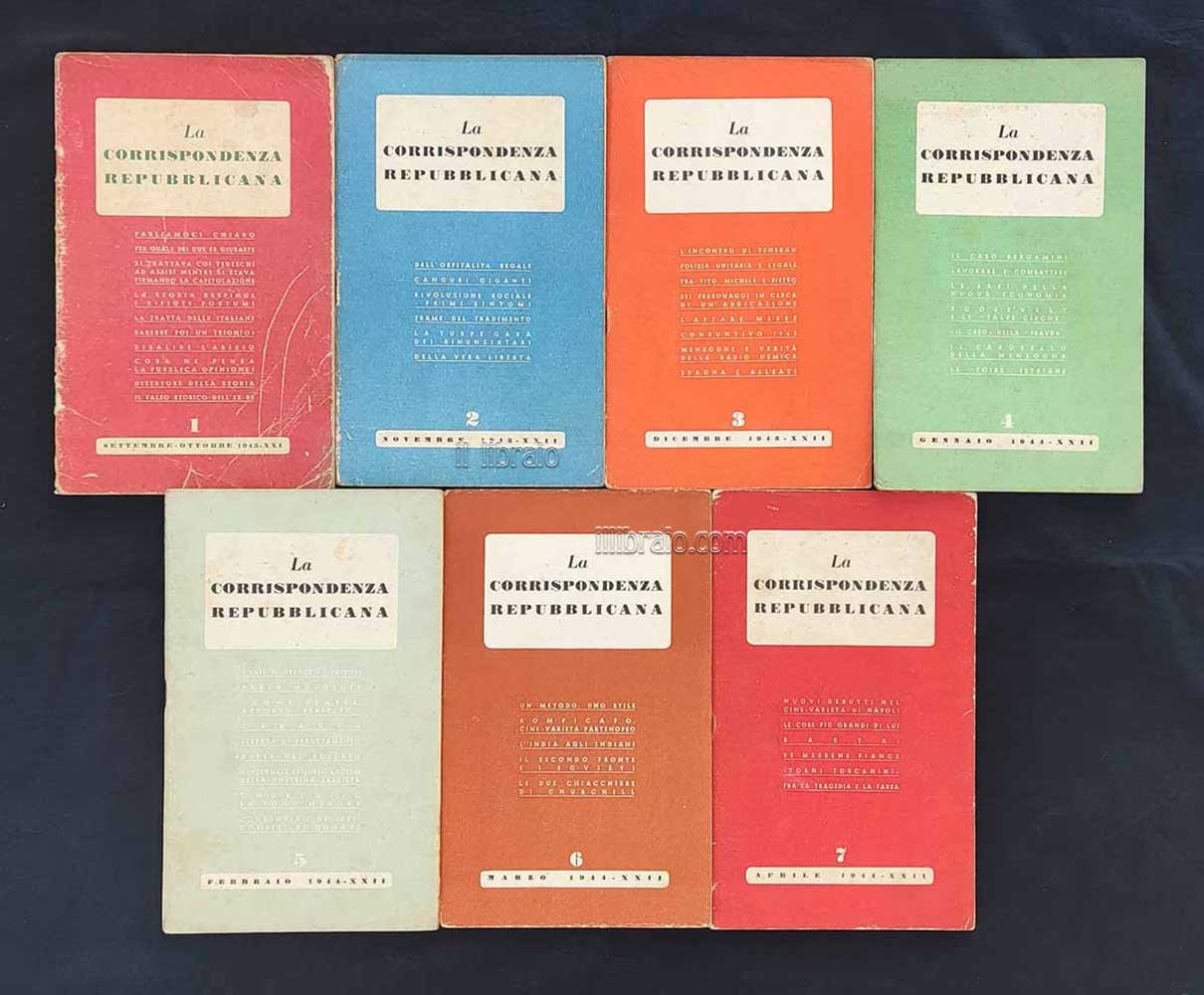 7 voll.; in 8°; pp. 202 complessive; br. Scritti pubblicati in forma anonima, ma attribuibili a Benito Mussolini. Pubblicazioni dal settembre-ottobre 1943 sino ad aprile 1944: 1 - settembre-ottobre 1943. 2 - novembre 1943. 3 - dicembre 1943. 4 - anno II, gennaio 1944. 5 - Febbraio 1944. 6 - Marzo 1944. 7 - Aprile 1944. Rara rivista d'epoca "repubblichina" ancora nella sua veste tipografica originale