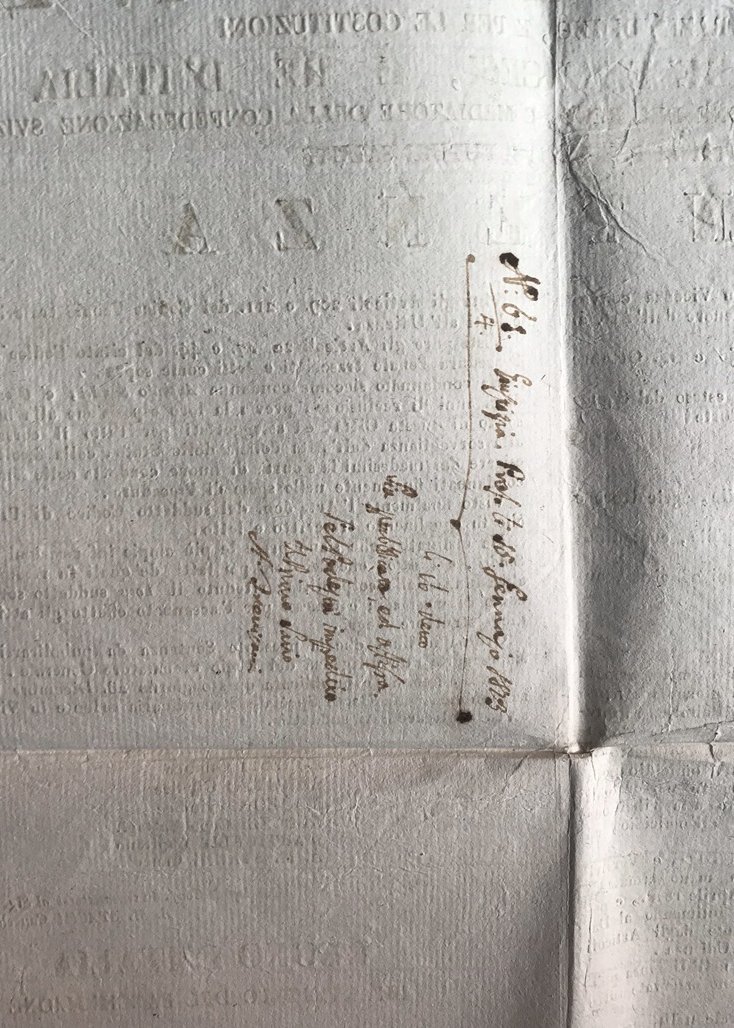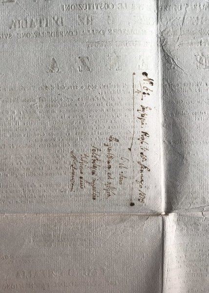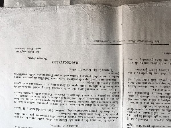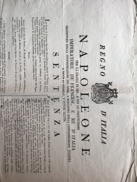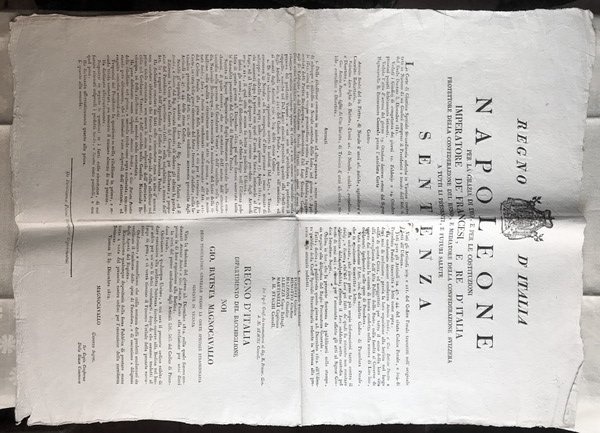 Manifesto 65 x 48 di cm circa, stemma araldico, 'Napoleone per grazia di Dio.' Sentenza emessa dalla Corte di Giustizia Speciale Straordinaria il 31 dicembre 1812 a carico di tre contadini e disertori per 'ribellione a mano armata di schioppo e coltello . omicidio e conato d'omicidio nella persona. a cui con un'archibujata fu perforato il cappello'. Non potendo provare che l'omicidio fosse commesso materialmente da uno di loro, i tre ebbero dieci anni di reclusione previa loro esposizione alla berlina. Presente sul retro Visto per l'esposizione manoscritto. Raro documento in buono stato di conservazione con inevitabili pieghe.