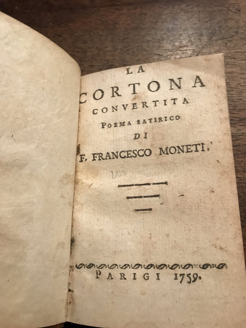 In-16, pp. XX, 113, leg. mezza pelle con titolo in oro al dorso. Precede l’opera, divisa in 6 canti, la vita dell’autore con le edizioni delle sue opere. Esemplare un po rifilato i testa, ma senza mancanze. Celebre poemetto satirico assai mordace contro i gesuiti, Per molti anni circolò manoscritto clandestinamente, ma fù così diffuso tanto da poter asserire che questa edizione è più rara delle copie che si trovano manoscritte. Piantanida 2974: “Rara edizione orig. sconosciuta alle maggiori bibliografie”. Parenti 'Falsi Luoghi' 161