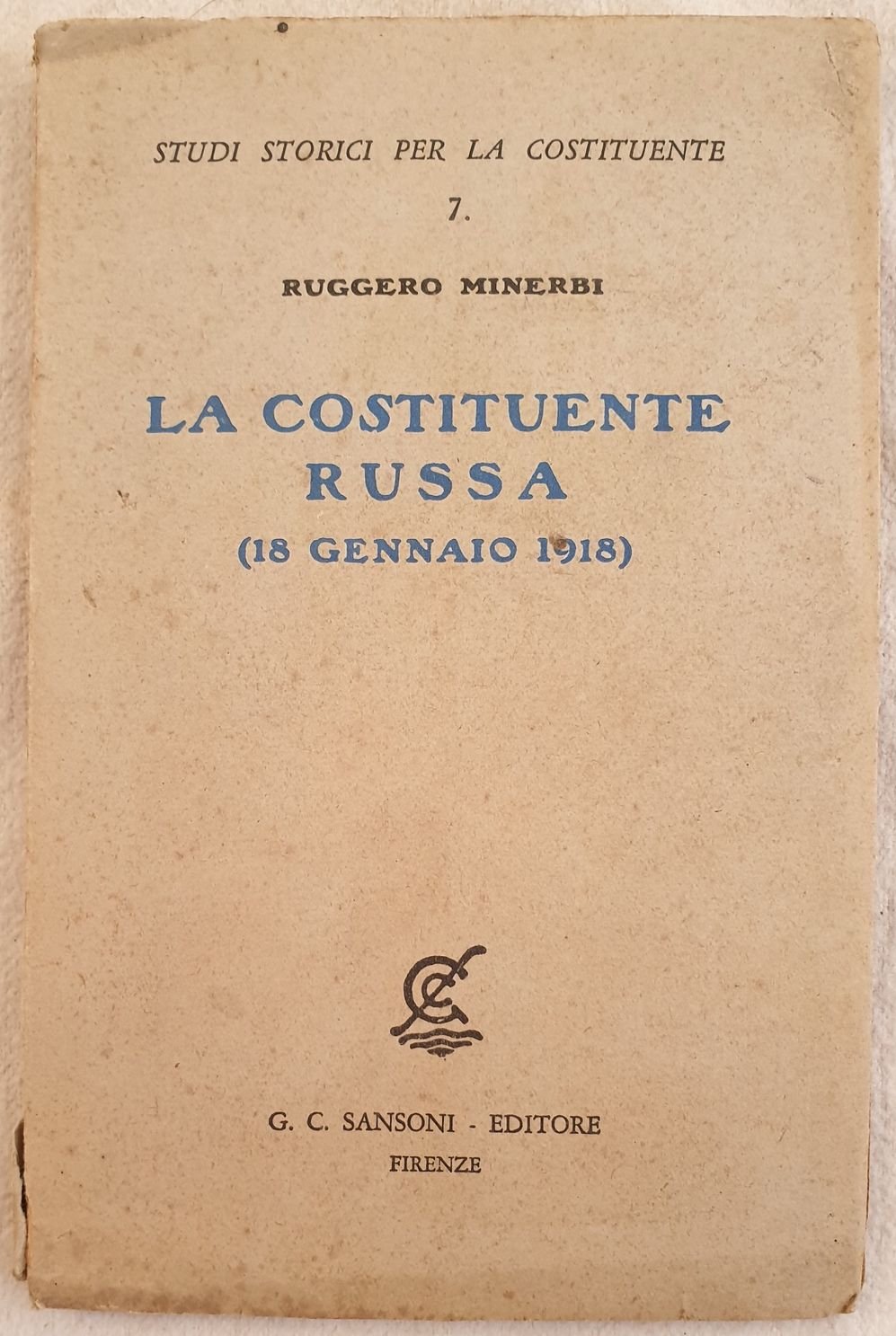 Edizione del 1946 di questo studio sulla costituente russa del 18 gennaio 1918 scritto da Ruggero Minerbi della collana "Studi storici per la costituente". In ottime condizioni. Copertina editoriale in ottime condizioni generali con lievi usure ai margini e dorso. Legatura in buone condizioni. All'interno le pagine si presentano in ottime condizioni con rare fioriture, ancora da tagliare. In 16. Dim. 18x12 cm. Pp. 87+(1). Edition of 1946 of this study of costituente russa of 18th of january 1918 written by Ruggero Minerbi of the series "Studi storici per la costituente". In very good conditions. Editorial cover in very good general conditions slightly worn in the edges and spine. Binding in good conditions. Inside pages are in very good conditions with occasional foxings, still uncut. In 16. Dim. 18x12 cm. Pp. 87+(1).