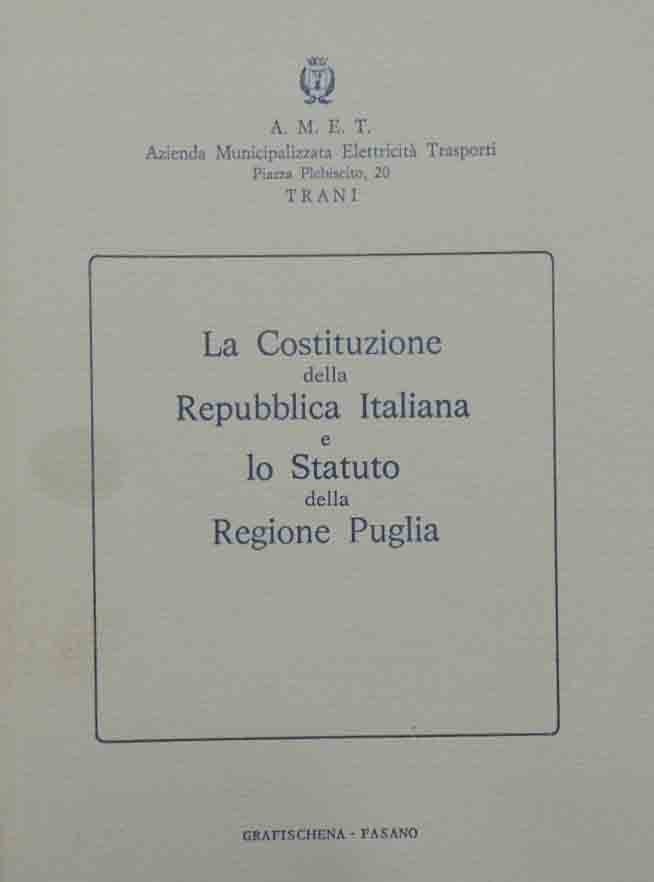 La Costituzione della Repubblica Italiana e lo Satuto della Regione Puglia, Grafischena, Fasano s.d. (1976), pp. 121, cm 20, br. ed. In testa al frontespizio: A. M. E. T. Azienda Municipalizzata Elettricità Trasporti, Piazza Plebiscito, 20, Trani. Una macchiolina alla prima di copertina, per il resto ben conservato.