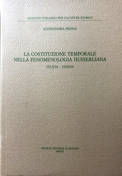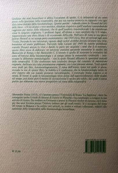 Soggetti: Filosofia Contemporanea, Fenomenologia, Tempo, Costituzione temporale, Edmund Husserl, Scritti husserliani, Zeitvorlesungen, 1905, Bernauer Manuskripte (BM), 1917/18, Manoscritti C, 1929/34, Idee, Urimpression, Kern, Coscienza, Urpräsentation, Datità, erfüllte Erwartung, Ereignis, Abklangsphänomen, Ritenzioni, Processo ritenzionale, Riempimento protensionale, Auffassung, Abklang, Modifikationen, Hyle, Postpräsentation, Jetzt-sein, Punto-Ora, Inconscio, Flusso, Fluire, Vita, Umfassende Form, Oggetto, Urstrom, Lebendige Gegenwart, Presente, Gegenwart, Meditazioni cartesiane, Cartesio, Bild, Totaleininug, Einigung, Kerngegenwart, Konkret strömende Wahrnemung-gegenwart, Astrazione, Riduzione fenomenologica, Scuola di Brentano, Temporalità, Zeitigung, Io, Erlebnisse, Immanenza, Novecento, Anni Trenta, Libri Vintage, Fuori catalogo, Saggi, Bibliografia, Frege, Gottinga, Friburgo, Rudolf Carnap, Lezioni, Presentazioni, Rappresentazioni, Intenzionalità, Logica, Dasein, Heidegger, Scheler, Ontologia, Epistemologia, Leibniz, Bolzano, Hume, Lotze, Georg Cantor, Phänomenologie, Filosofi austriaci, Filosofi tedeschi del XIX secolo, Contemporary Philosophy, Phenomenology, Time Constitution, Writings, Manuscripts, Ideas, Consciousness, Dates, Retentions, Retention process, Protensional Filling, Point-Hour, Unconscious, Flow, Flowing, Life, Object, Cartesian Meditations, Descartes, Abstraction, Phenomenological reduction, School of Brentano, Temporality, Io, Immanence, Twentieth century, Thirties, Books out of print, Essays, Bibliography, Friborg, Lectures, Presentations, Representations, Intentionality, Logic, Ontology, Epistemology, Austrian Philosophers, 19th Century German Philosophers