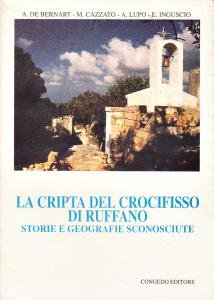 84 pagine. Ill. colori e b/n. Brossura con alette. cm 17 x 24. Indice: pag. 5 Don Nino Santoro, Introduzione; 7 Aldo De Bernart, Momenti di storia della cripta del SS. Crocifisso (o di Santa Costantina) a Ruffano; 23 Mario Cazzato, Le coordinate storiche e geografiche dell'insediamento grottale di S. Costantina o del Crocifisso in territorio di Ruffano; 47 Antonio Lupo, La cripta di Santa Costantina (o del SS. Crocefisso). Il sito, il contesto storico-culturale, l'habitat rupestre); 69 Ermanno Inguscio, Il Crocifisso nella pietà popolare