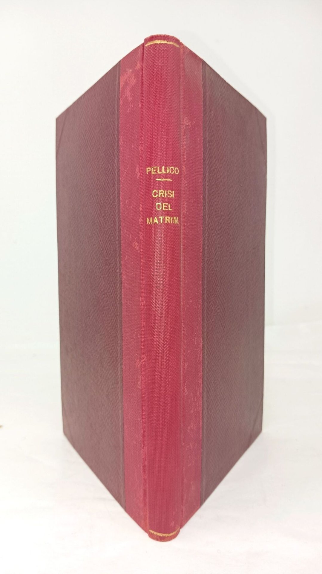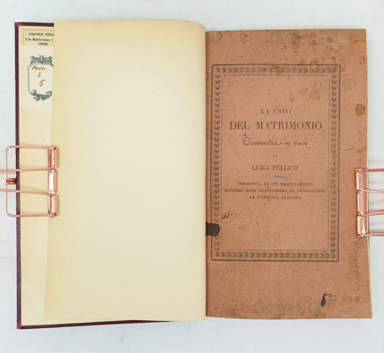 >In -8 (mm 220 x 130), pp. 158 più 1 di errata. Mezza tela con titolo dorato sul dorso, bross. edit. cons. "La crisi del matrimonio - Commedia in versi di Luigi Pellico, preceduta da un ragionamento intorno alla convenienza di verseggiare la commedia italiana". Erudita dissertazione del fratello di Silvio Pellico sul matrimonio. L'opera è scritta in versi in quanto l'autore asserisce che "i versi sciolti non sono poi sempre così sdegnosi, che non sappiano all'uopo presentarsi condecentemente, benchè privi di splendidi ornamenti, e non abbiano miglior garbo di qualunque prosa corretta e disinvolta".Esemplare perfettamente conservato.