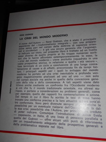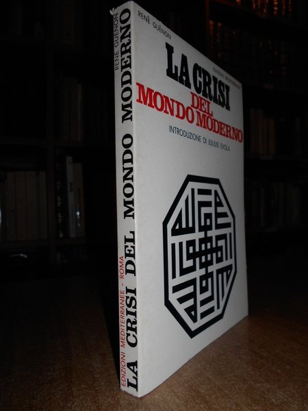 René, Guénon. Roma, Edizioni Mediterranee, 1972. La crisi del mondo moderno. Traduzione e introduzione di Julius Evola. In-8° piccolo, cart. edit. 161, (2) pp. In ottimo stato di conservazione. Uff. stanzetta mob. piccolo a destra