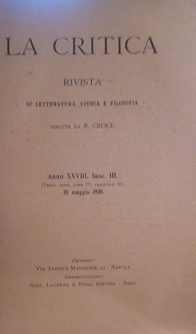 LA CRITICA - RIVISTA DI LETTERATURA, STORIA E FILOSOFIA DIRETTA DA B. CROCE - ANNO XXVIII FASC. III - 20 MAGGIO 1930
