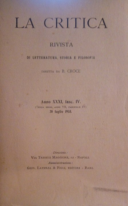 LA CRITICA - RIVISTA DI LETTERATURA, STORIA E FILOSOFIA DIRETTA DA B. CROCE - ANNO XXXI, FASC. IV- 20 LUGLIO 1933