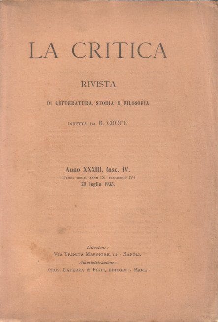La Critica. Rivista di letteratura, storia e filosofia diretta da B. Croce. Anno XXXIII, fasc. IV. (Terza serie, anno IX, fascicolo IV) 20 luglio 1935