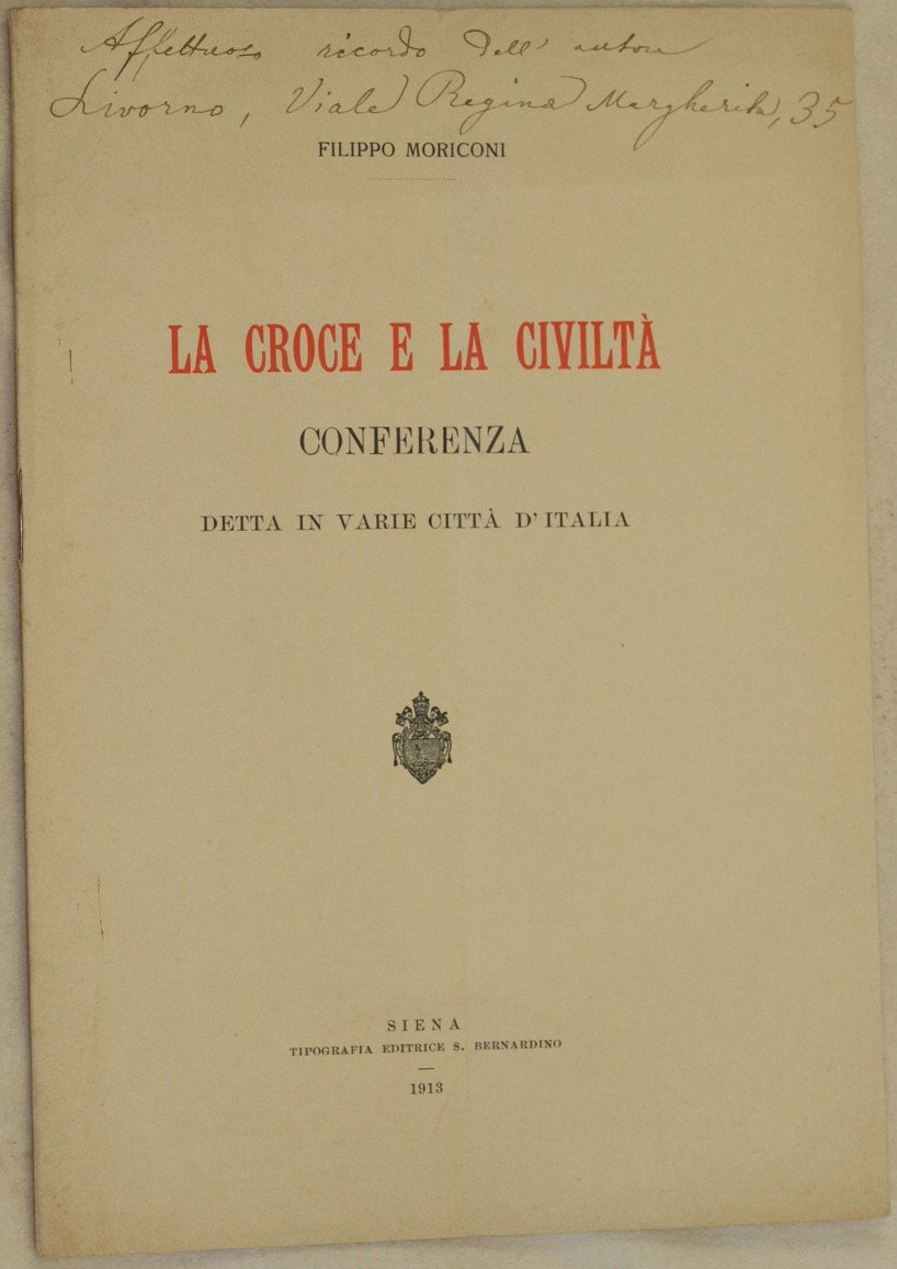 In 8. Dim. 24,5x17 cm. Pp. 21+(1). Pubblicazione del 1913 sulla conferenza di Filippo Moriconi "La croce e la civiltà". Dedica manoscritta dall'autore in copertina. In buone condizioni. Copertina editoriale in buone condizioni generali con lievi usure ai margini e dorso. Legatura in ottime condizioni. All'interno le pagine si presentano in buone condizioni con rare fioriture. Piegatura verticale. Pammphlet of 1913 about the conference of Filippo Moriconi "La croce e la civiltà". Handwritten dedication of the author in the cover. In good conditions. Editorial in good general conditions slightly worn in the edges and spine. Binding in very good conditions. Inside pages are in good conditions with occasional foxings. Vertical folding.