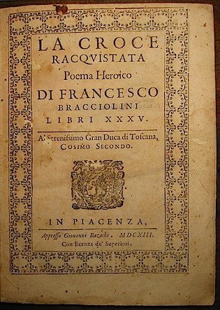 8vo (cm. 22,4), 4 cc.nn., 306 pp. Frontis. entro ricca cornice xilografica con piccola vignetta allegorica (Cerbero tricipite latrante alle porte dell’Averno. Motto: ‘Fida custodia’). Capilettera, fregi e testatine n.t. Illustrazione xilografica a metà pagina con il simbolo di una croce al verso della quarta carta. Testo su due colonne. Cartonato ottocentesco con titolo oro su tassello in pelle al ds. (lievi tracce d’usura). Tagli scuri. Alcuni piccoli fori di tarlo al frontis. (restaurati) e sulle successive quattro carte (dove ledono in minima parte il testo). Macchioline d’inchiostro a p. 21. Tenui aloni marginali e qualche carta un po’ brunita. Nel complesso buon esemplare. Edizione non comune. Graesse I, 517; Vinciana, 2736.