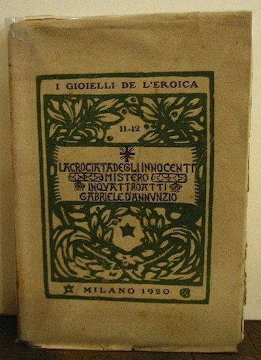 16mo (cm. 18,5), 86 pp., 5 cc.nn. Frontespizio, fregi e 12 disegni (di cui 4 a piena pagina) di Emilio Mantelli. Brossura editoriale a stampa nera con incisione in verde di E. Mantelli. Carta a mano con barbe. Collana ‘I gioielli dell’Eroica’ nn. 11-12. Ottimo esemplare. De Medici, 103; Guabello, 255; Vecchioni, 40b.