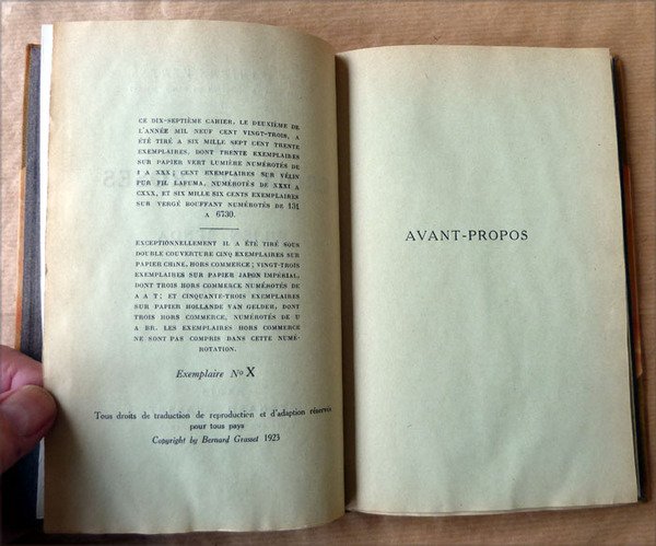 Un volume de format petit in 8° de 116 pp.; sur papier vert; reliure en demi maroquin à coins pistache; dos lisse; titres dorés. Couverture entièrement conservée. Un des 30 exemplaires de tête, sur papier vert lumière. Quelques discrètes traces sur le dos et le premier plat. Voir photo. Exemplaire désirable.