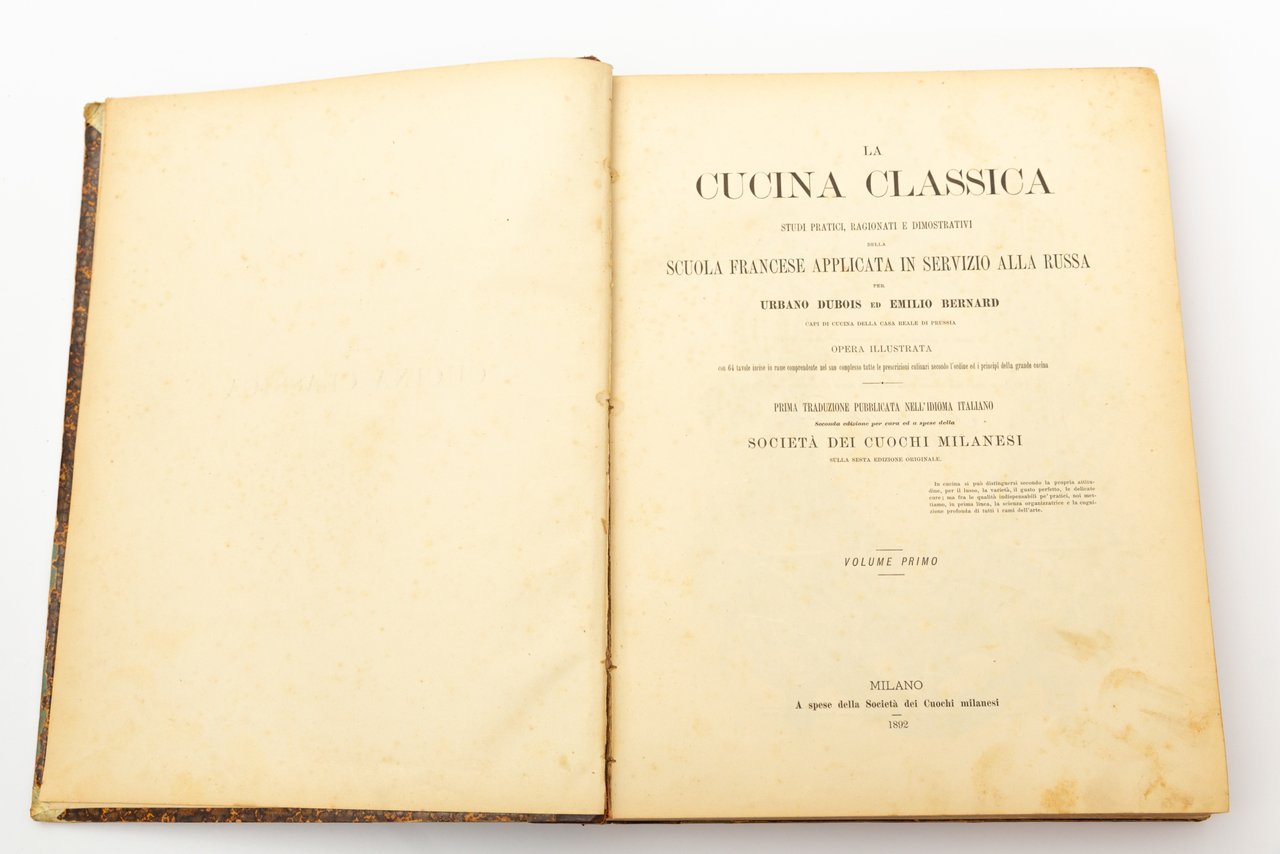La cucina classica. Studi pratici, ragionati e dimostrativi della scuola francese applicata in servizio alla russa per Urbano Dubois ed Emilio Bernard. Opera illustrata con 64 tavole incise in rame comprendente nel suo complesso tutte le prescrizioni culinari secondo l'ordine ed i principi della grande cucina. Prima traduzione pubblicata nell'idioma italiano. Seconda edizione per cura ed a spese della Società dei Cuochi Milanesi, sulla sesta edizione originale.