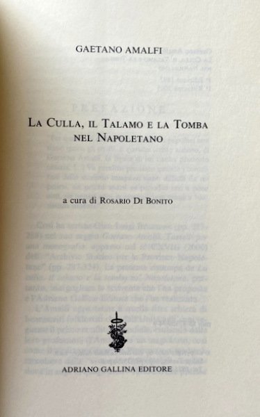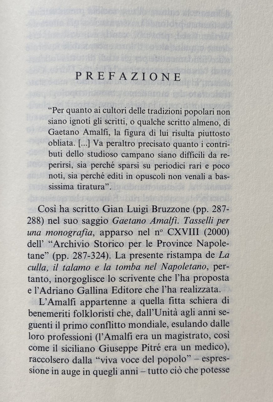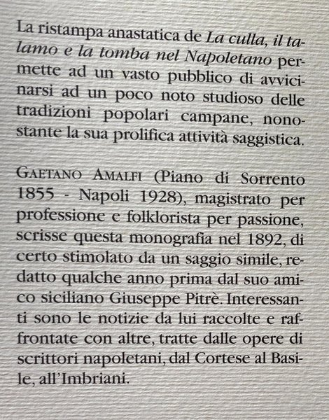 La ristampa anastatica de La culla, il talamo e la tomba nel Napoletano permette ad un vasto pubblico di avvicinarsi ad un poco noto studioso delle tradizioni popolari campane, nonostante la sua prolifica attività saggistica. Interessanti sono le notizie da lui raccolte e raffrontate con altre, tratte dalle opere di scrittori napoletani, dal Cortese al Basile, all'Imbriani.