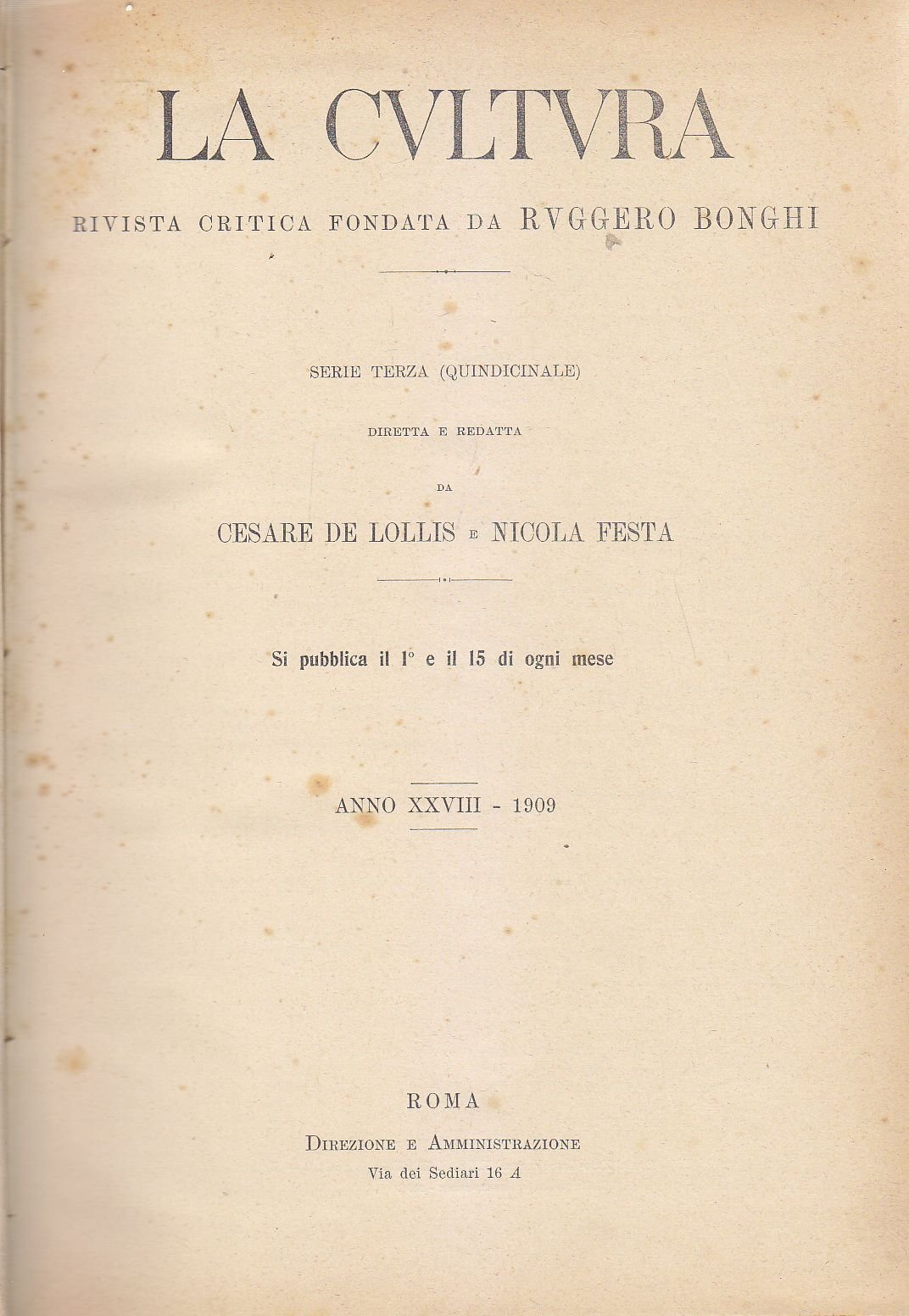 LA CULTURA rivista critica fondata da Ruggero Bonghi, Diretta e redatta da Cesare De Lollis e Nicola Festa