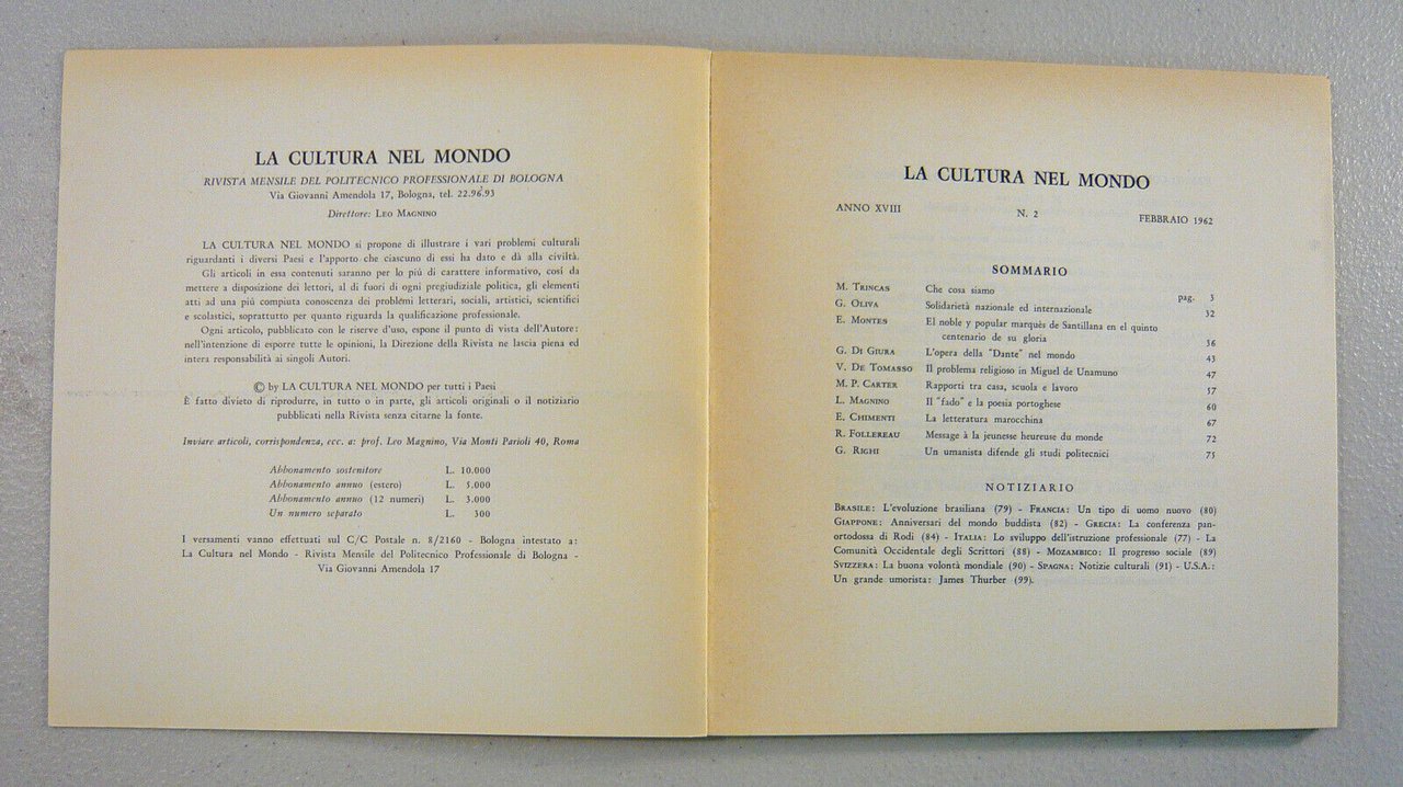 LA CULTURA NEL MONDO n.2 1962.Mensile del Politecnico Professionale di Bologna