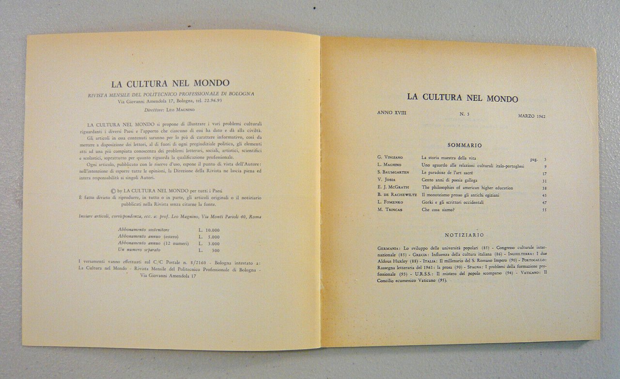 LA CULTURA NEL MONDO n.3 1962.Mensile del Politecnico Professionale di Bologna