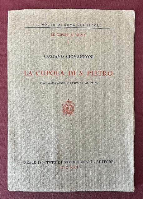 Istituto di Studi Romani Editore, 1942 – XXI. Casa Editrice Cremonese, Roma, Concessionaria per la vendita. Arti Grafiche Panetto & Petrelli, Spoleto 11 – 1942 – XXI. Fa parte della Collana “Il volto di Roma nei secoli”. Le Cupole di Roma. Numero I. Con 8 illustrazioni e 6 tavole fuori testo. In 8vo, pp. 22 intervallate da chiarissimi disegni, prospetti e piante, in fine VI tavole fuori testo stampate su carta più lucida. Interessante e ben dettagliato sia testualmente che graficamente, sia dal punto di vista storico che architettonico. Ottimamente impresso e con belle illustrazioni, molto ben conservato.