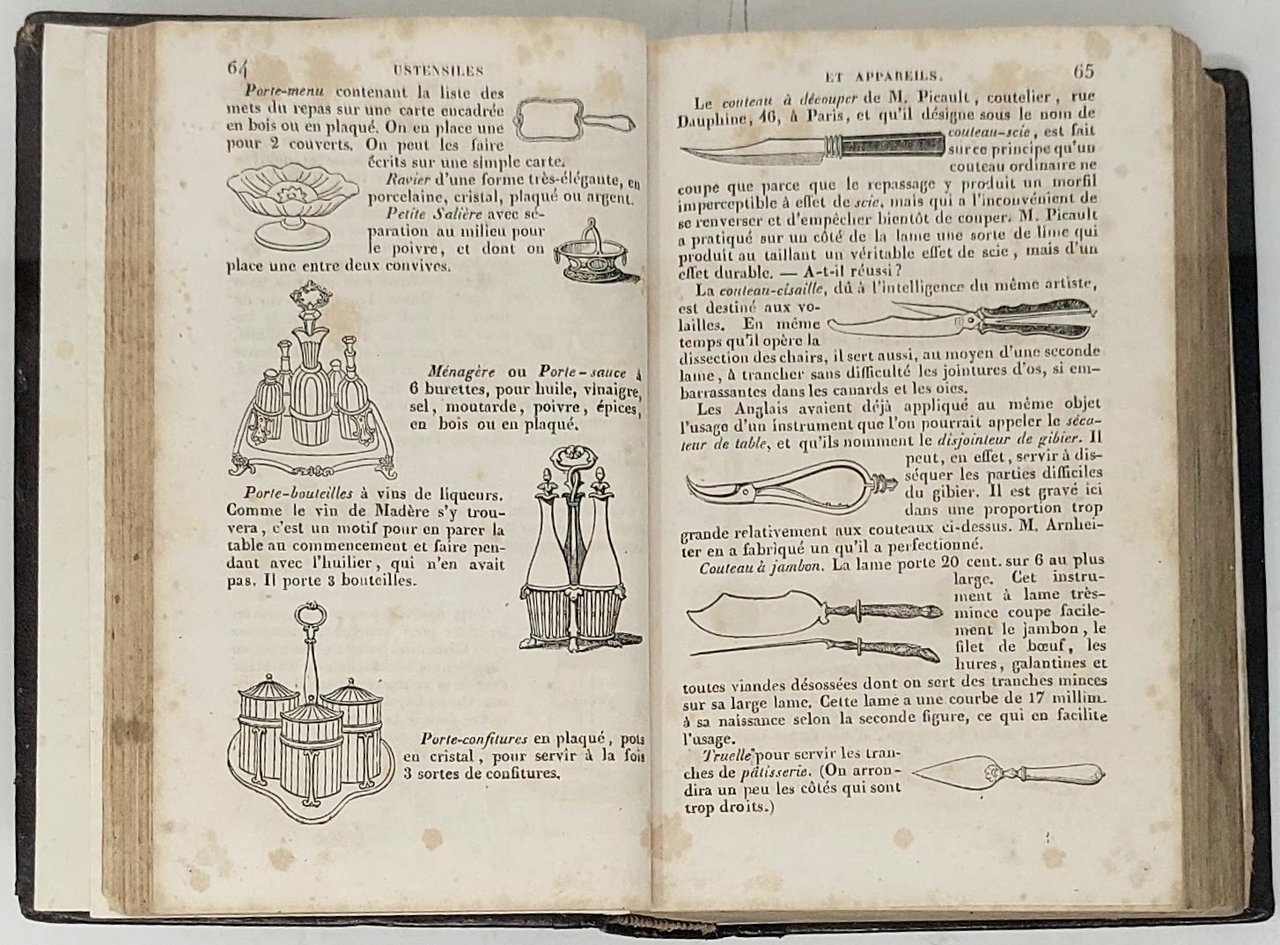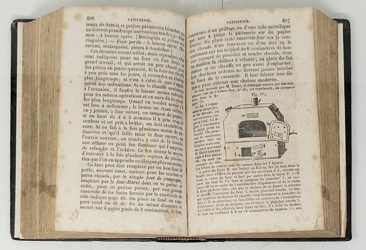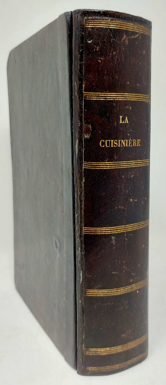 >in-8 (mm 175x103), pp. 654, 11, (1), 4. Nel testo 300 piccole litografie, a piena pagina e colorata l'illustrazione al verso della prima carta. Legatura coeva in pelle, dorso liscio scandito da filetti in oro, con titolo breve in caratteri dorati. Trentaquattresima edizione di uno dei più fortunati ricettari gastronomici dell'Ottocento, destinato a sostituire la Cuisine Bourgeoise di Menon. La prima edizione apparve nel 1818, priva dell'indicazione del nome dell'autore. Ne sono note, fino ai primi decenni del Novecento, almeno cento edizioni. Il manuale raccoglie circa 1500 ricette appartenenti a diverse tradizioni culinarie europee. Tradotto precocemente in spagnolo, italiano e inglese, ebbe vastissima distribuzione commerciale, e fu tra i primi ricettari francesi a essere pubblicato negli Stati Uniti. Ne sono note contraffazioni, tanto che all'occhietto è stampato l'articolo 425 del codice penale, “toute contrefaçon est un délit”. Le ultime pagine comprendono un estratto dal catalogo di Audot, e un interessante avviso editoriale. Esemplare discreto, usuale brunitura delle carte, diffuse fioriture e aloni, più evidenti ai primi due fascicoli. Al contropiatto anteriore ex libris ‘Ex Bibliotheca Gastronomica Claudio Benporat'. Vicaire 54: “véritable best-seller pendant tout le XIXe siècle”; Oberlé 179.
