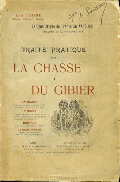 Paris, H. Laurens, Libraire-Editeur ; Saint-Quentin, Imprimerie Paul Lebrault, S. d. (1900). Grand In-8 broché, couverture illustrée d’une vignette, 664 p. Couverture jaunie avec petits manques et nom manuscrit ; manques sur le dos. Cette encyclopédie du chasseur contient une multitude d’articles intéressants sur le gibier de plaine, de bois, à courre et à tir, au marais, en rivière, à la mer. Comment on l’élève, comment on le chasse, comment on le conserve, comment on le prépare. L’histoire de la chasse et des armes de chasse. Le braconnage. Il traite également de la fauconnerie, de la chasse au miroir, des pièges, des loups, nombreuses recettes de cuisine, un important chapitre est consacré aux chiens. Edition originale rare. Thiébaud, 885.