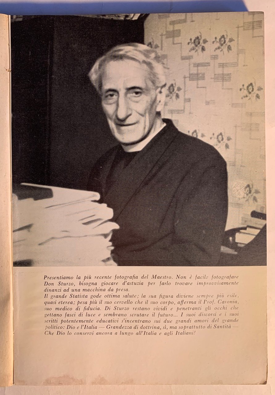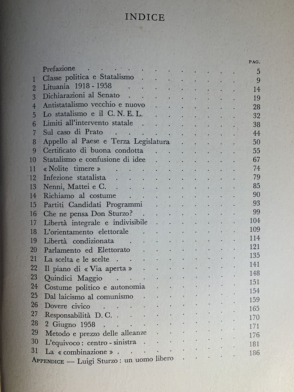 I ed. della raccolta (Raccolta di articoli dal 13 febbraio al 20 giugno 1958). VIII/ 196/ brossura in cartoncino bianco liscio con titoli in nero. Con un ritratto fotografico in b/n di Luigi Sturzo in una tavola patinata f.t.. Stato buono (usura della copertina - bruniture e piccole fioriture in copertina e nelle pagine).