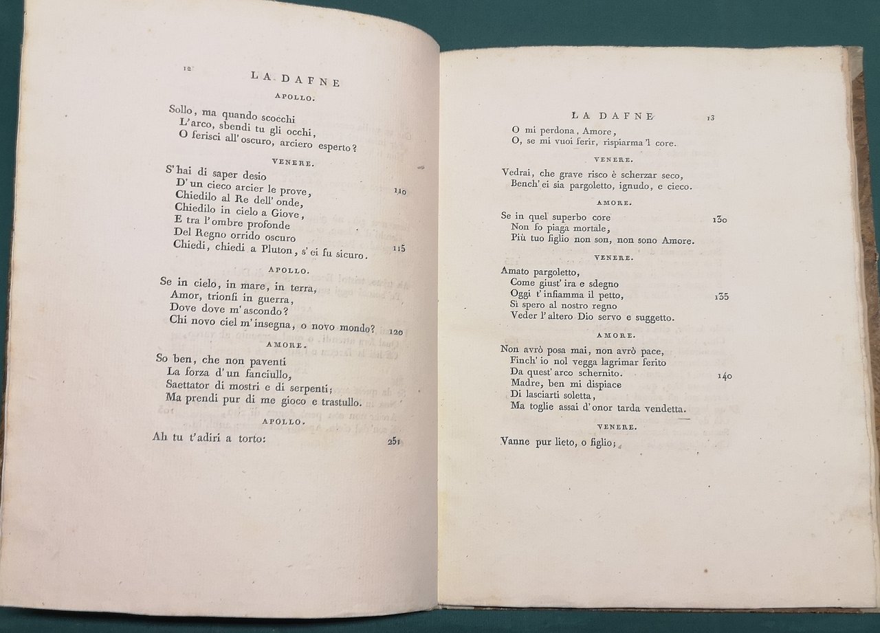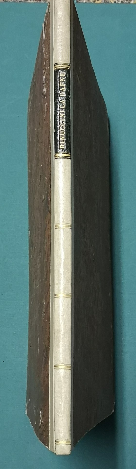 >in-4, pp. 62, (2 bianche), leg. coeva m. pergamena, titolo in oro su tassello al dorso. Terza edizione (la prima apparve nel 1600, la seconda nel 1608), fatta per nozze, assai stimata, curata dall'abate Luigi Fiacchi, che vi aggiunse un'ampia Lettera (sotto lo pseudonimo di L. Clasio), ''ricca di belle notizie, e non ommise le Varianti del dramma tolte o dalle anteriori stampe, o da un codice Magliabechiano'' (Gamba). Com'è noto, la Dafne, nell'originale del 1600, è il primo libretto d'opera nella storia del melodramma, pietra miliare dell'opera lirica nei secoli. Venne rappresentata a Palazzo Pitti nel febbraio 1600, alla presenza dei Granduchi. Ottavio Rinuccini (Firenze 1562-1621) fu poeta, seguace del Tasso e del Chiabrera. Ottimo esemplare su carta distinta e forte, a grandi margini intonsi. Gamba 844: «Bella, nitida e corretta edizione». Sonneck, I, 339.