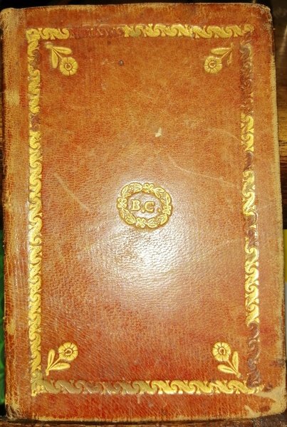 In-16 (12 cm) 80. Legatura in piena pelle: ai piatti cornice dorata, con motivo floreale ripreso agli angoli ed al centro dentro corona floreale le iniziali B. C. Contropiatti rivestiti di carta marmorizzata.