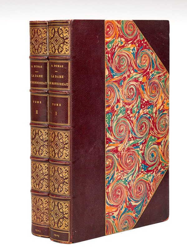 Compositions de Maurice Leloir, gravures sur bois de J. Huyot, 2 vol. in-4 reliure demi-chagrin à coins lie-de-vin, dos à 5 nerfs richement orné, filet doré en mors et coins, tête dorée, couvertures et dos conservés, date en queue, Calmann Lévy, Paris, 1903, 499 pp. et 1 f. ; 488 pp. et 1 f. Bon état pour cet exemplaire bien relié, complet de la couverture d'origine (très petits frott. en reliure, coins lég. frotté, qq. rouss. mais bon exemplaire par ailleurs). Suite de "La Reine Margot", la "Dame de Monsoreau" mêle les intrigues, d'un côté la "petite histoire" avec la passion amoureuse de Louis de Clermont, seigneur de Bussy d'Amboise, pour Diane de Méridor, épouse du comte de Monsoreau, de l'autre la "grande histoire", en cette période troublée du règne d'Henri III avec la rivalité du Roi envers son frère François, duc d'Alençon puis duc d'Anjou.