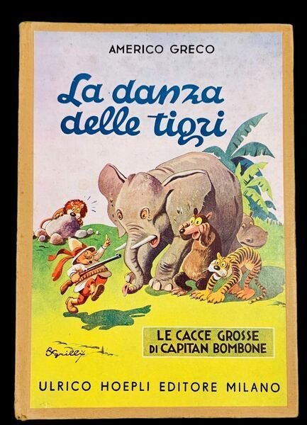 23,5x17 cm; 199 pp. con gustosi disegni n.t. e 8 tavv. col. f.t. su carta patinata. Legatura editoriale in pieno cartoncino con titolo impresso in nero al dorso e al piatto anteriore applicato disegno a colori di Sgrilli. Prima edizione ancora in barbe, rara a trovarsi in queste ottime condizioni di conservazione, di questo curioso e simpatico volume per bambini opera del noto scrittore di volumi per ragazzi e romanzi fantascientifici, Americo Greco che fu anche un ghostwriter degli apocrifi di Emilio Salgari. A lui, ad esempio, si deve il romanzo Il Corsaro Rosso uscito nel 1941 ed attribuito a Salgari. Il volume si avvale dei bellissimi disegni che illustrano il racconto delle folli cacce di Capitan Bombone, realizzati dal noto pittore, fumettista e animatore italiano, Roberto Sgrilli (Firenze, 23 ottobre 1897 1985). Sgrilli, collaboratore, inizialmente, di celebri riviste umoristiche come Mondo umoristico e Numero, intorno agli anni 20' venne chiamato ad illustrare le storia de Il Balilla. Nel 1925 inizia la collaborazione con il Corriere dei Piccoli. Nel 1934 appaiono sul Corriere dei Piccoli le storie del personaggio Fanfarino prima e poi, Formichino. Negli anni quaranta realizza alcuni cortometraggi animati come Il barone di Münchhausen (1941) e Anacleto e la faina (1942) per il quale venne premiato alla 10ª Mostra internazionale d'arte cinematografica di Venezia. Prima edizione, ottimo esemplare.