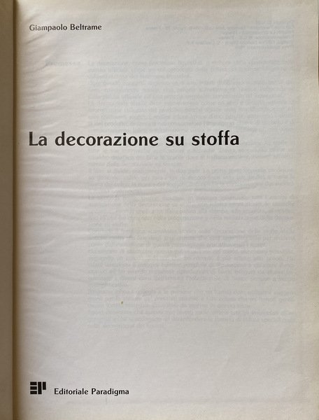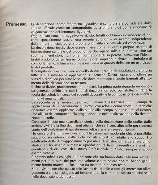 Il compito di questo volume è quello di divulgare la decorazione su stoffe in tutte le sue intrinseche applicazioni e tecniche. Dovrà soprattutto offrire un sussidio didattico per tutte le scuole dove si trattano materie inerenti all'argo mento della decorazione su tessuto. Il libro si divide, praticamente, in due parti.
