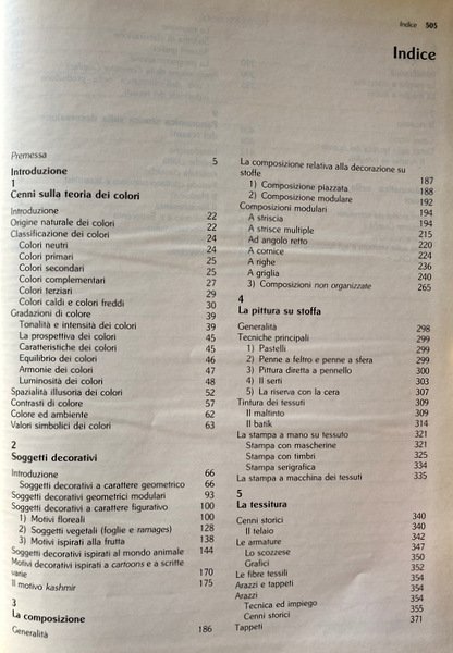 Soggetti: Disegno professionale, Moda, Design, Abbigliamento, Tintura, Decoro, Motivi ornamentali, Tessitura, Tessuti, Pittura, Decorazione, Arte, Stoffe, Colori, Figure geometriche, Cornici, Ricamo, Disegni, Ornamenti, Effetti, Righe, Scuola di istruzione e formazione professionale, Tecniche, Stile, Stilisti, Abiti, Figurino, Guide, Esempi, Teoria dei Colori, Manuali, Testi scolastici, Ragazzi, Materiale educativo, Didattica, Testi didattici, Apprendimento, Arti figurative, Manualità, Applicazioni pratiche, Fantasie, creatività, Gusto, Ottocento, Novecento Settecento, Storia, Costume, Neoclassicismo, Sartoria, Disegnare, Dipingere, Colori caldi e freddi, Neutri, Tonalità, Intensità, Resa, Contrasti, Caratteristiche, Gradazioni, Prospettiva, Spazialità, Armonia, Luminosità, Motivi floreali, Fiori, Soggetti, Foglie, Ramages, Vegetali, Frutta, Animali, Cartoons, Fumetti, Scritte, Kashmir, Strisce, Composizione, Angolo, Griglia, Feltro, Pastelli, Penne a sfera, Cera, Maltinto, Batik, Stampa serigrafica, Serigrafie, Timbri, Macchina, Mascherine, Telaio, Armatura, Grafici, Scozzese, Fibre tessili, Arazzi, Tappeti, Tecnica, Maglia, Mano, Intaglio, Cucito, Informatica, Computer graphics, Grafica, CPU, Sistemi grafici, Memorie, Programmazione, Digitale, Produzione indutriale, Medioevo, Rinascimento, Seicento, Arte bizantina, Arte sacra, Cristianesimo, Arte primitiva, Collezionismo, Libri rari Vintage Fuori catalogo, Scuole, Istituti, Progettazione, Stilista, Carriera, Lavoro, Intreccio, Disco di Newton, Bianco, Nero, Blu, Verde, Rosso, Giallo, Arcobaleno, Viola, Arancione, Luce, Pesci stilizzati, Geometrie, Spirale, Farfalle, Cotone, Cromatismo, Pompei, Rosso pompeiano, Seta, Greche, Batista, Mussola, Velluto, Barocco, Artigianato, Raso, Damasco, Francia, Manifatture, Taffettà, Broccato, Cina, Compagnia delle Indie, Italia, Venezia, Trine, Merletti, Guide pratiche, Hobby, Tempo libero, Libri illustrati, Professional drawing, Fashion, Clothing, Dyeing, Decoration, Ornaments, Weaving, Fabrics, Painting, Art, Fabrics, Colors, Geometric figures, Frames, Embroidery, Drawings, Ornaments, Effects, Lines, School of education, Training professional, Techniques, Style, Stylists, Clothes, Fashion sketch, Guides, Examples, Color Theory, Manuals, Schools, Kids, Material, Didactics Texts, Learning, Figurative arts, Manual skills, Practical applications, Fantasies, creativity, Taste, Nineteenth, Twentieth, Eighteenth century, History, Costume, Neoclassicism, Tailoring, Draw, Paint, Warm cold colors, Neutral, Shades, Intensity, Yield, Contrasts, Characteristics, Gradations, Perspective, Spatiality, Harmony, Brightness, Floral motifs, Flowers, Subjects, Leaves, Vegetables, Fruit, Animals, Comics, Writings, Stripes, Composition, Angle, Grid, Felt, Pastels, Ballpoint pens, Wax, Screen printing, Screen printing, Stamps, Machine, Masks, Loom, Armor, Scottish, Textile fibers, Tapestries, Carpets, Technique, Knitting, Hand, Carving, Sewing, Computer graphics, Graphics systems, Memories, Programming, Digital, Industrial production, Middle Ages, Renaissance, Seventeenth century, Byzantine Sacred art, Christianity, Primitive art, Collectibles, Rare books out of print, Institutes, Career, Work, Weaves, White, Black, Blue, Green, Red, Yellow, Rainbow, Purple, Orange, Light, Stylized fish, Geometries, Spiral, Butterflies, Cotton, Chromatism, Pompeii, Pompeian red, Silk, Greek, Muslin, Velvet, Baroque, Craft, Satin, Damask, France, Manufactures, Brocade, China, Italy, Venice, Lace, Practical guides, Free time, Illustrated books