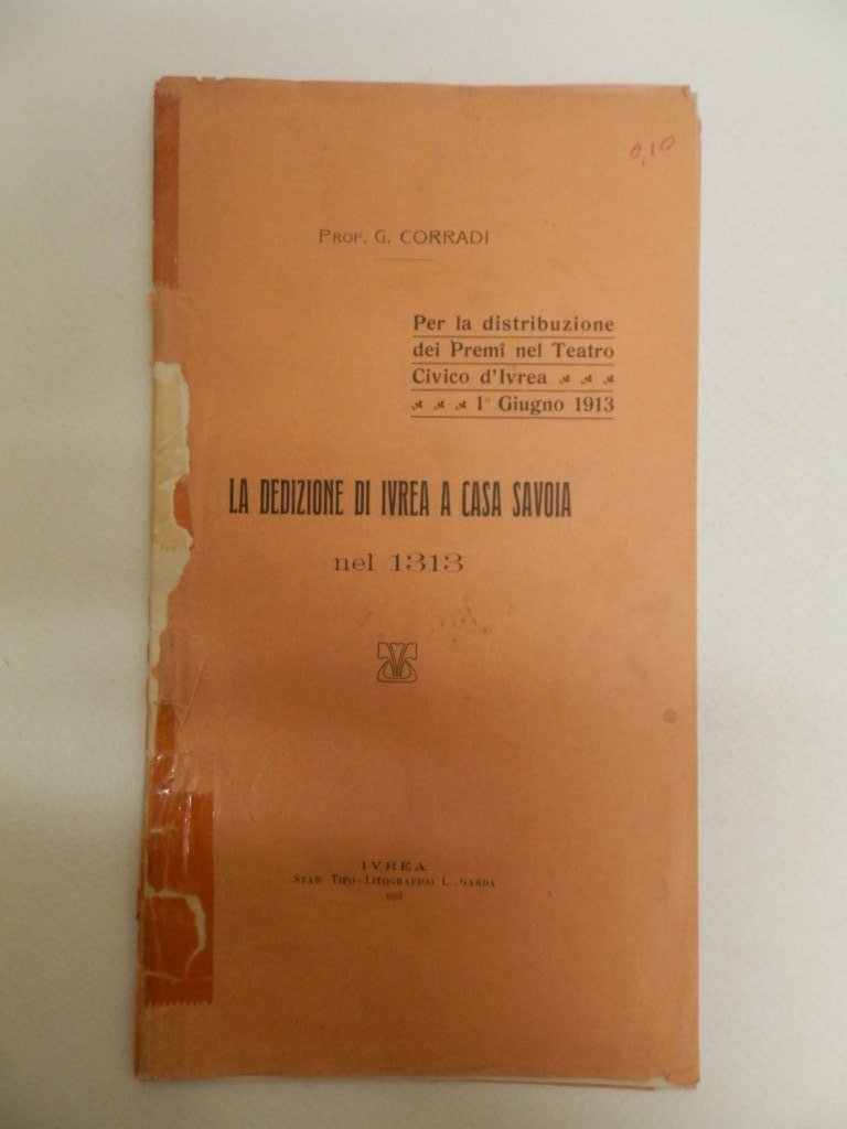 8^, pp. 19, brossura editoriale, titolo al piatto, mancanze al dorso che è restaurato da nastro adesivo, l'interno molto buono. Discorso in occasione della distribuzione dei Premi nel Teatro Civico di Ivrea 1^ giugno 1913. *** TUTTI I NOSTRI LIBRI SONO VISIBILI PREVIO CONTATTO MAIL O TELEFONO NELLA NUOVA SEDE DI MILANO: LIBRERIA COSMOPOLIS, VIA JOMMELLI, 22. ***