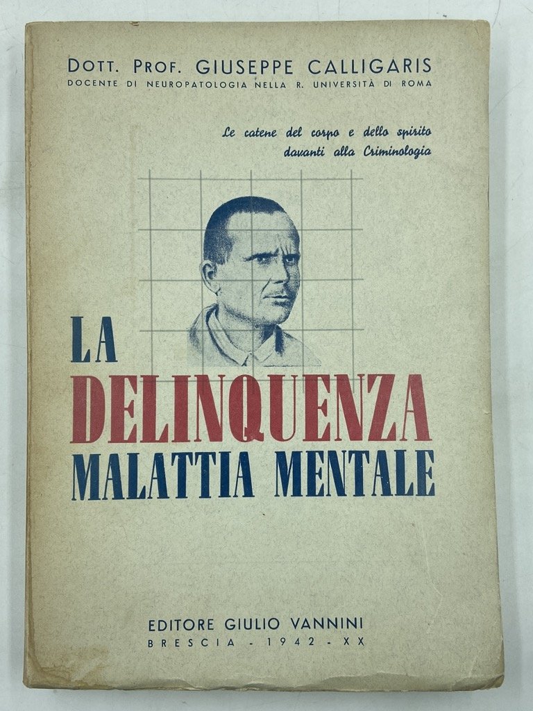 Brossura editoriale illustrata, cm 25 x 18, pp XII 387 (1), illustrazioni in nero nel testo e 7 tavole. Piccola mancanza sull’angolo inferiore interno del margine delle ultime pagine (373-388) e del piatto posteriore (vedi foto), per il resto in buono stato, firma a matita rossa sul frontespizio. Il friulano G. Calligaris, neurologo, medico di guerra,e fino agli anni '10 docente universitario, dagli anni '20 sviluppò una teoria delle «linee cutanee iperestesiche» e una «trousse» brevettata (riprodotta al primo contropiatto, con prezzo e istruzioni per ordinarla) allontanandosi dalla scienza «ufficiale» e ad avviando ricerche di stampo decisamente parapsicologico. In questo volume, riallacciandosi a ricerche lombrosiane e fisiognomiche, identifica un particolare agente patogeno che causa la delinquenza in quanto patologia, le «placche cutanee» che lo rivelano, l'intervento sulle invisibili «catene del corpo e dello spirito» che permettono di identificare la colpevolezza, ecc.