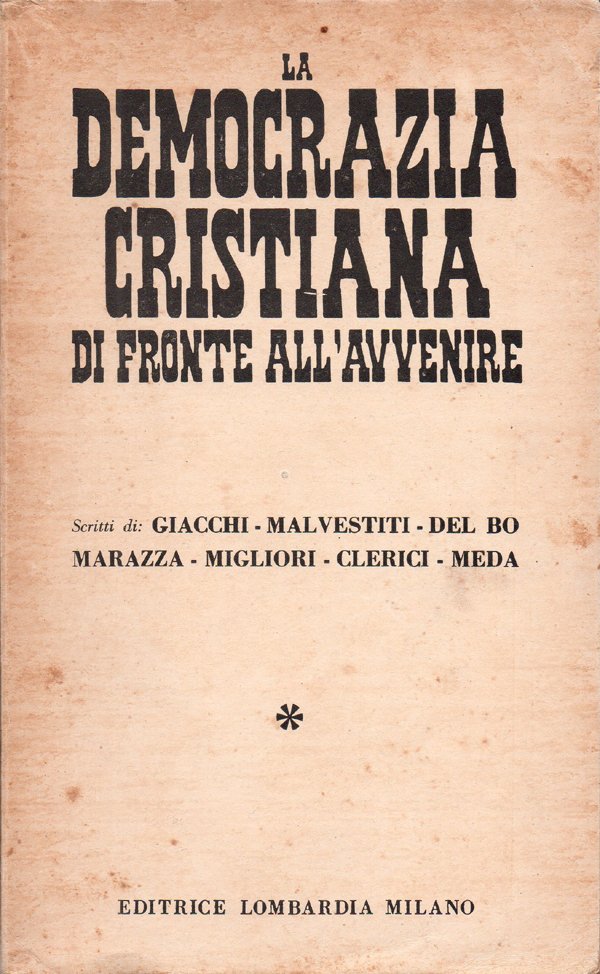 In-16° (19,5 x 12 cm), pp. 224, (4), copertina editoriale senza sovraccoperta. Qualche segno del tempo alla copertina. Nell'angolo superiore esterno del foglio con le pagine 119-120, mancanza reintegrata con carta giapponese, con due lettere, una per pagina, cadute, riscritte a matita. Nella parte inferiore di pagina 136, bianca, leggere impronte lasciate dalle dita di una mano. Piccoli segni d'umido al taglio di testa e a qualche pagina. Normale patina del tempo alle pagine, con leggere arrossature dovute al tipo di carta. Volume numero uno nella serie "Politica d'oggi ". Indice: Orio Giacchi, Presentazione. Il nostro Partito e la sua lotta per la democrazia; Piero Malvestiti, Introduzione al Congresso; Dino Del Bo, La Democrazia Cristiana e il vincolo fra politica estera e politica interna; Achille Marazza, Autocritica; Giambattista Migliori, La Democrazia Cristiana e i problemi morali e religiosi del nostro Paese; Edoardo Clerici, La lezione della Storia; Luigi Meda, La Democrazia Cristiana e la Comunità Europea di Difesa.