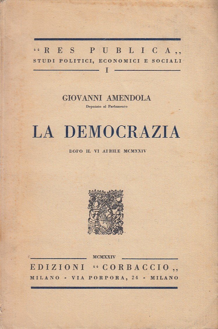 In-8 (Cm 19 x 13), pp. XVI-169, brossura editoriale con sovraccoperta. Collana Res Publica, 1. Ritratto di Amendola all'antiporta. Pochi segnetti a matita, millimetico strappetto al dorso, normali segni del tempo. BUONO