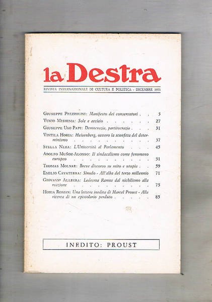 La Destra rivista internazionale di cultura e politica, che annovera nel comitato intrernazionale: Mircea Eliade, Ernst Jünger, Giuseppe Prezzolini, ecc. Anno I° n° 1 unico uscito dell'annata. Contiene tra l'altro una lettera inedita di M. Proust alla ricerca di un epistolario perduto.